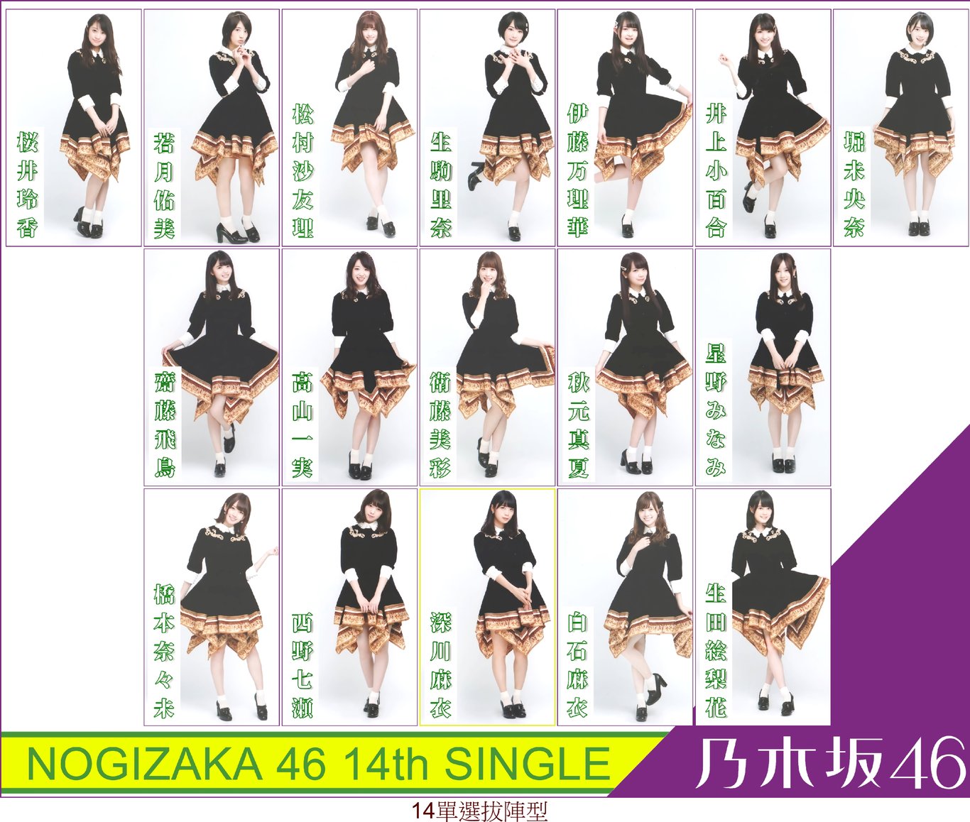 中村麗乃、佐藤楓、向井葉月、伊藤理々杏、山下美月、大園桃子、与田祐希、久保史緒里、阪口珠美、岩本蓮加、吉田綾乃、梅澤美波