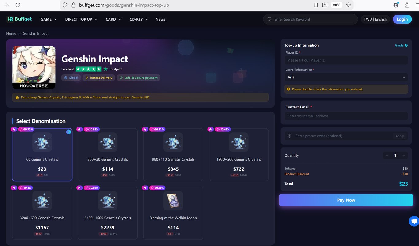 By using buffget, you can secure a consistent 20% discount on your top-ups. This is a massive advantage. Instead of paying full price to hit pity, that 20% savings can be the difference between getting a C0 Columbina and securing her signature weapon, "The Weeping Dove." In a game where resource management is key, paying full price when a safe, cheaper alternative exists is simply inefficient.