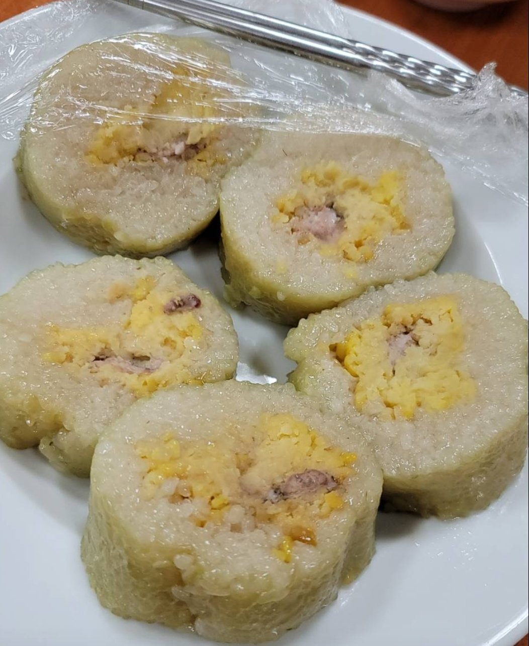 其實我也喜歡吃糯米,現在台灣時,想想也沒有太多的場合機會吃到,即使在端午節。小時候過節家裡會有粽子,現在沒人會包粽子,也不會刻意去買,好像粽子熱量高,吃多了會消化不良等等,大家也不怎麼愛吃。上次經過黃仁勳吃過,八德路上的府城肉粽,本想進店吃一個,但看到長長的排隊人龍及一顆肉粽 NT.80 的價格,瞬間顛覆了我的三觀,是離開台灣太久嗎?對於糯米飯,想起小時後爸媽常帶我們去恩主公 (行天宮) 拜拜,廟門外常有很多歐巴桑販賣拜拜用的香還有米糕,圓形的米糕用玻璃紙包裹著,中間有一顆桂圓。甜甜的米糕,Q彈糯軟的口感,真的很好吃,直到現在我還是忘不了的好滋味。