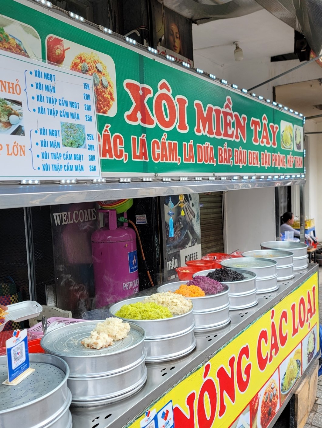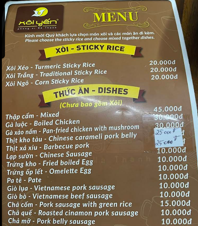 Xôi Yến 是河內老城區的一家糯米飯名店,之前我曾經提到數次,店面不大,桌椅擺到店外的人行道上,基本的糯米飯20K,有三種選擇 Xôi Xéo (黃色(薑黃)糯米飯),Xôi Trắng (傳統白糯米飯),Xôi Ngô (糯米飯+玉米),選好糯米後,可再選擇配料,如炸雞蛋,雞肉,叉燒,臘腸等等。