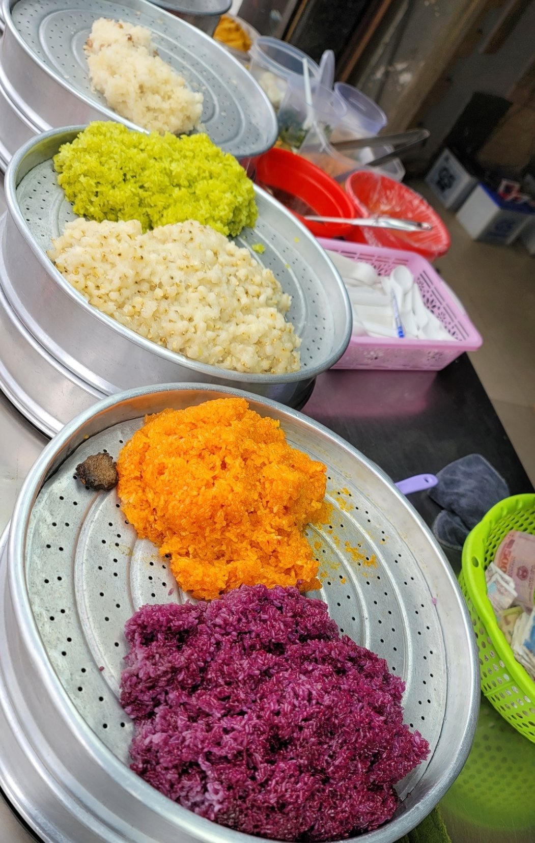 越南糯米飯 (Xôi):有鹹有甜,可配烤肉、綠豆(鹹)或椰奶(甜)。也可加到冰品裡面,如紫米,綠米,是我夏日很喜歡的一道甜品,既消暑又可以吃到甜甜QQ的糯米,雙重口感,口味酸酸甜甜,老實說,比起加珍珠,我更喜歡加了糯米的優格冰沙。
