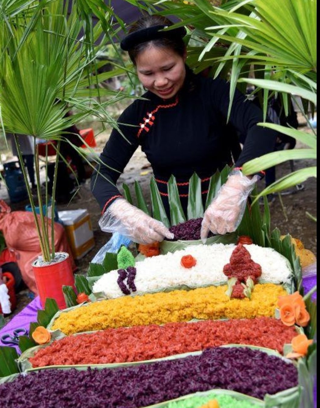 五色糯米飯是越南西北部山區少數民族(岱依族Tày、儂族Nùng、泰族Thái)的傳統特色美食,由白、紅、綠、黃、紫五種顏色組成,分別象徵五行(金、水、火、木、土)(Kim-Thủy-Hỏa-Mộc-Thổ),。它寓意吉祥、繁榮、富足和國家團結,常出現在節慶、新年慶典和喜慶場合。五彩糯米飯以糯米為原料,用植物天然萃取物進行染色,佐以芝麻鹽和烤肉食用,味道鮮美,色香味味俱全。它常用於宗教儀式,精心擺放成色彩鮮豔的花朵形狀,也展現了製作者精湛的技藝。