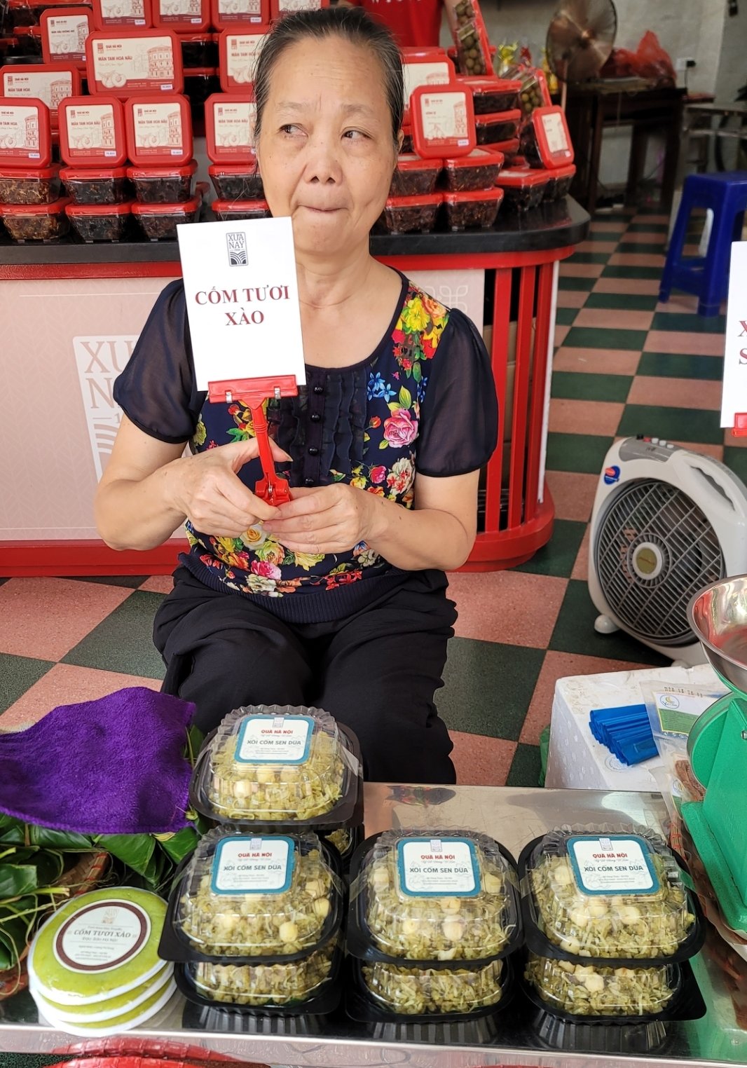 用蕉葉包裹糯米飯,手法質樸卻是一種傳統又方便的選擇。蕉葉不僅能保持糯米飯的溫度和香味,還能增添一絲淡淡的香氣。這種包裝方式在糯米飯外帶攤位上非常受歡迎,適合忙碌的人們快速、方便、營養地享用早餐,也給觀光客一種屬於越南農村、純樸的體驗。河內秋天的「綠米」(Cốm)是一種用低溫烘焙未成熟糯米所製成的。以越南綠米製成的傳統糕點,是河內秋季的代表性美食,中秋節時也用來祭祖,在河內老城區,即是以這種傳統的方法,用蕉葉包裹綠米販賣。