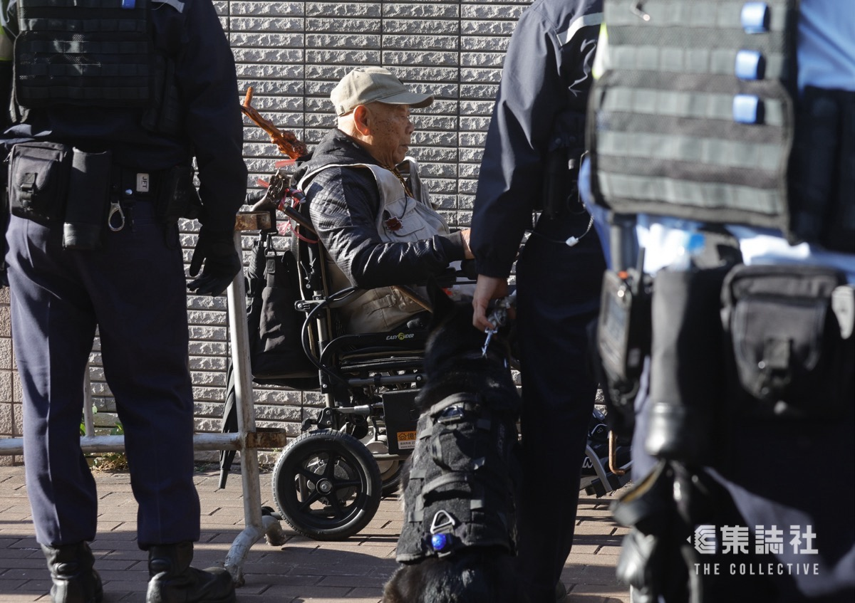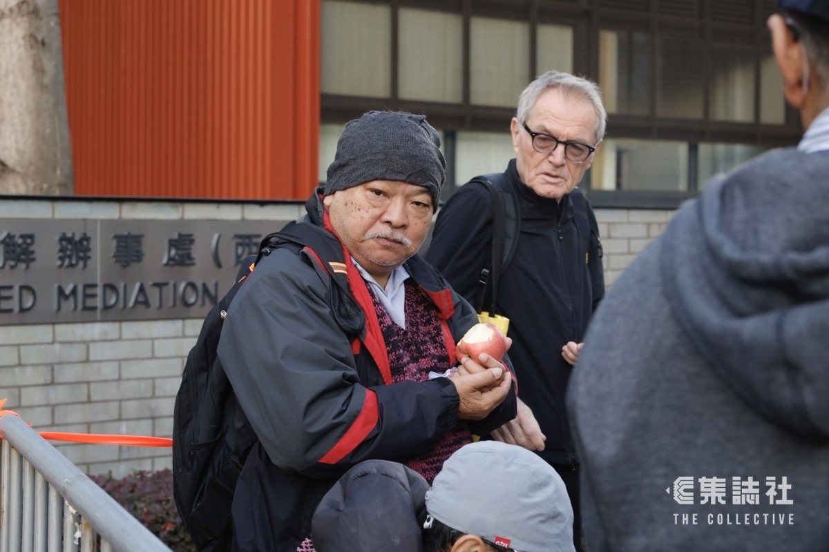 過去一直旁聽多宗案件、年過百歲的大黃伯,今日坐著輪椅堅持到場排隊旁聽。去年 6 月和 11 月,大黃伯旁聽 47 人求情和判刑時,曾表示受「腳腫」困擾,撐著兩枝拐杖、要人撐扶。今年 8 月中,控辯雙方開始就蘋果案進行結案陳詞時,大黃伯亦有到場旁聽。