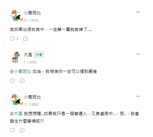 我就說....,如果我身在其中,一定第一幕就掛掉....,然後大風安慰我: