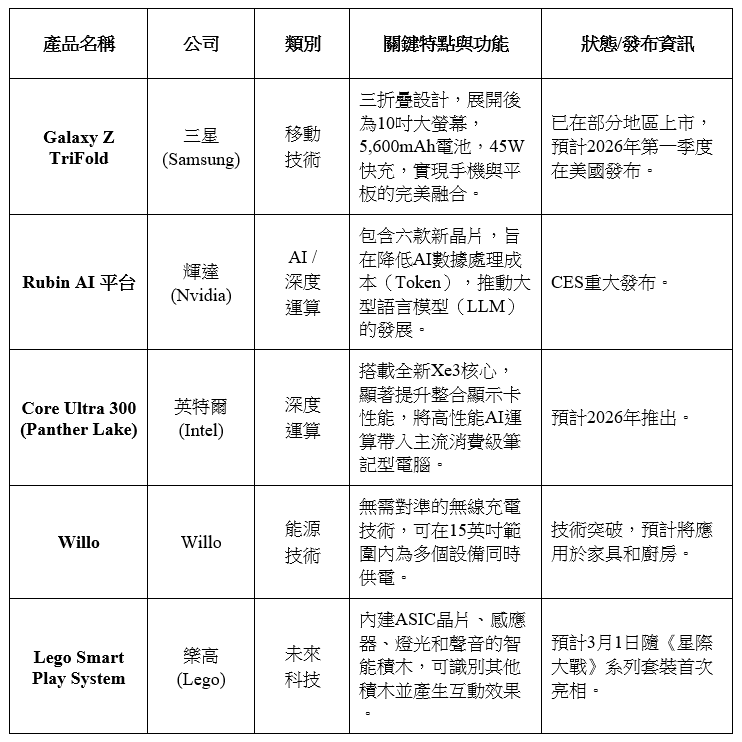 展會的最高榮譽「CES 2026 最佳產品獎」(Best Overall)由三星 Galaxy Z TriFold奪得,這款三折疊手機/平板混合裝置被視為折疊技術邁向實用化的重要里程碑 [2]。