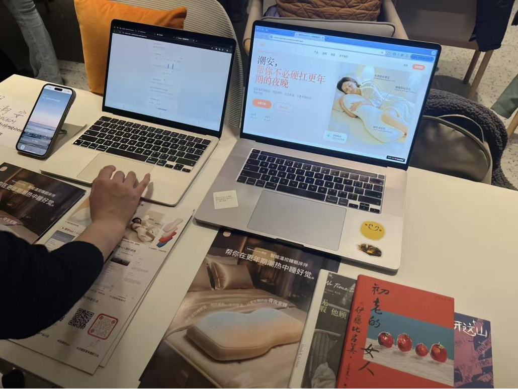 Helen去年读了伊藤比吕美的《闭经记》,发现妈妈在更年期会经历这么多症状,而这些都被她忽视了,所以想做更年期相关的产品。组员哒哒对此感同身受,去年,她的妈妈得了直肠癌,四十几岁就提前进入了更年期,可是癌症患者没法用激素疗法,潮热发作会很难受,哒哒就想着“至少做点什么让妈妈晚上能睡着”。于是,大家决定做一个智能温控抱枕,软件和硬件结合,利用AI算法预测体温突变,在潮热来临前自动降温。版本一是在抱枕里加一层半导体芯片,由于不好散热,在我采访时,产品形态已经迭代成一张床垫,利用水循环实现降温。