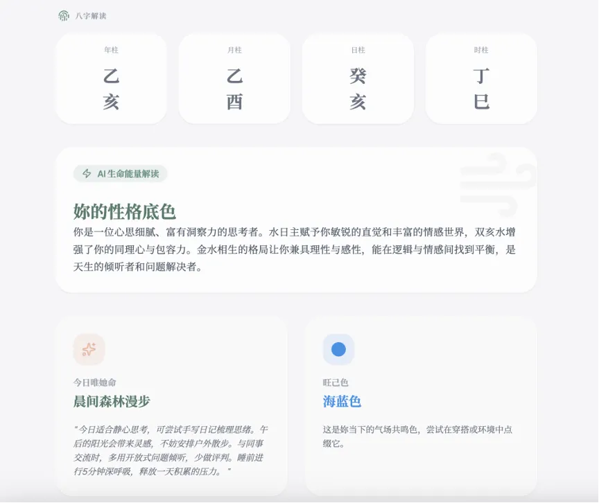 果不其然,输入生辰信息后我发现,日柱癸水的我经常被说优柔寡断,在这儿变成“拥有坚定的包容力”,直接让我对未来的人生都拥有了更多信心。