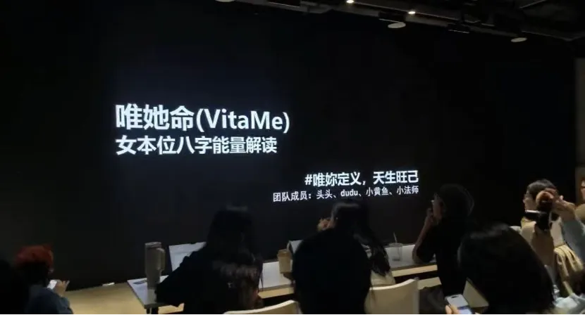 路演那天,我首先被一个算命摊吸引了,对,顾名思义的算命。这个小组的产品名叫“维她命”,不是泰格西那首歌,而是一个女本位八字解读器,她们希望利用AI、破除命理中贬低女性的一面。产品想法源于发起人头头对古典命理中女性失语现状的愤怒,愤怒之余,她还想过报名“女本位八字课程”,但学费要2000块,这才有了自己做点什么的念头。