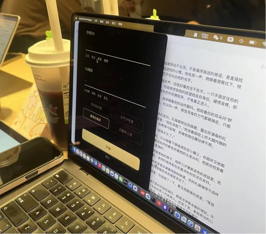 越过算命摊,另一个摊位不时发出兴奋的笑声。我凑过去,一篇R18美文映入眼帘,尺度不能说很大,但也快进入正题了:“他的手顺着你腰侧往上滑,停在锁骨处轻轻摩挲。”这是一款女性向 AI 幻想产品,名叫“Velvet天鹅绒”,幻想对象可以医生和教授,也可以是民工和外卖小哥,若对选项不满意,也能手动输入,算法会输出小说和ASMR音频。路演当天,此项目获得了最佳利她技术奖,嗯,很有道理。
