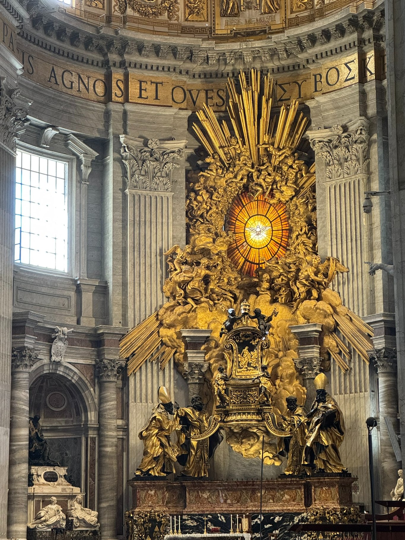 这个金光灿灿四周放光芒的东西是圣伯多禄宝座。据说黄铜椅子包裹的是一把木质宝座,曾经由圣彼得本人使用。宝座由四位教会圣师托举,上方是彩绘玻璃中的鸽子代表圣灵,四周放射的光线仿佛天堂降临。