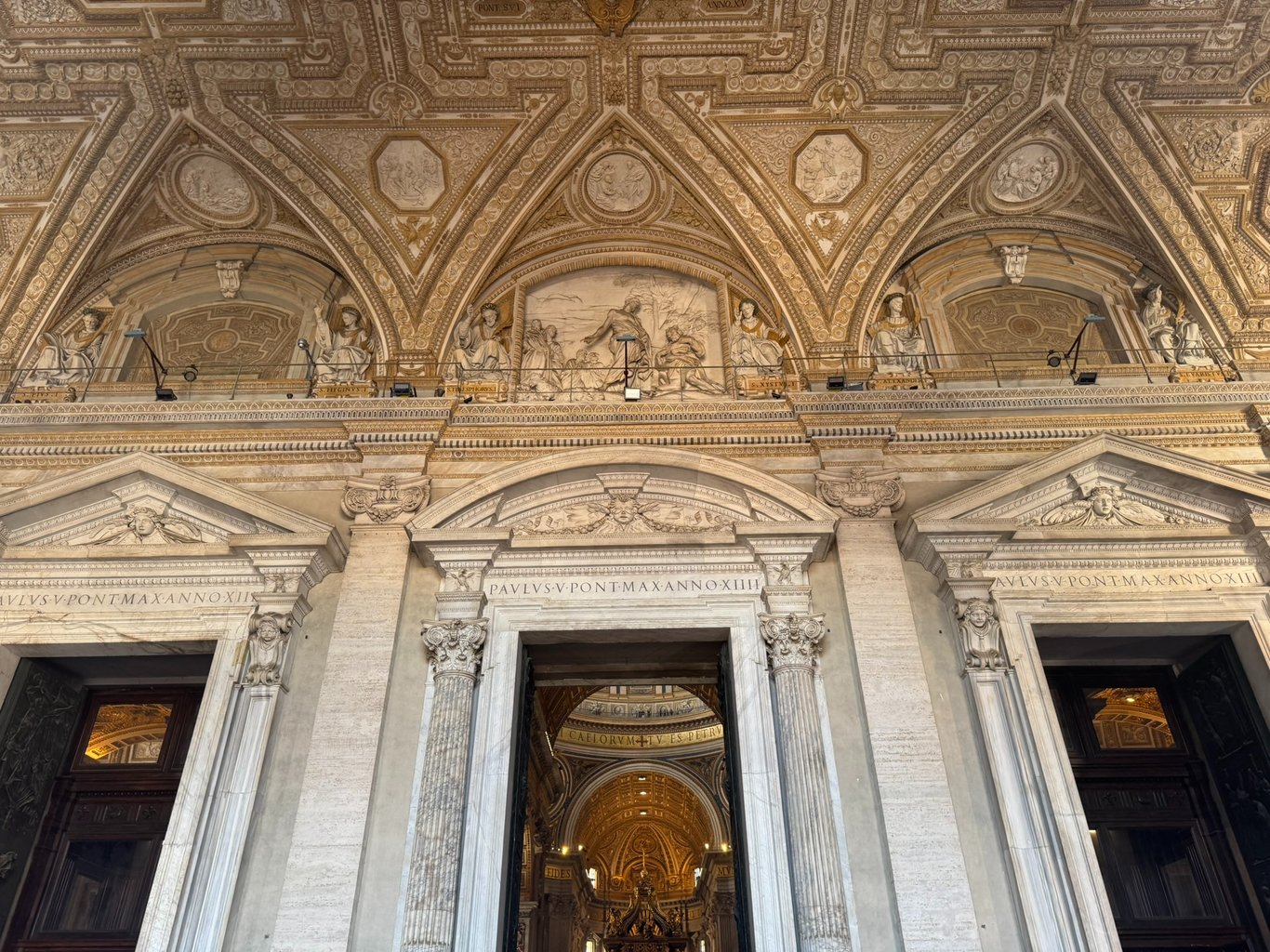 排了40分钟之后终于进入和圣彼得教堂。在这座教堂中即使最不起眼的地方也是有说法的。门的上方是由贝尼尼创作的浮雕,描绘了耶稣复活后对使徒彼得说“喂养我的羔羊”。这幅作品象征了基督将统领教会的最高权柄正式交托给了圣彼得,显示天主教的合法地位。