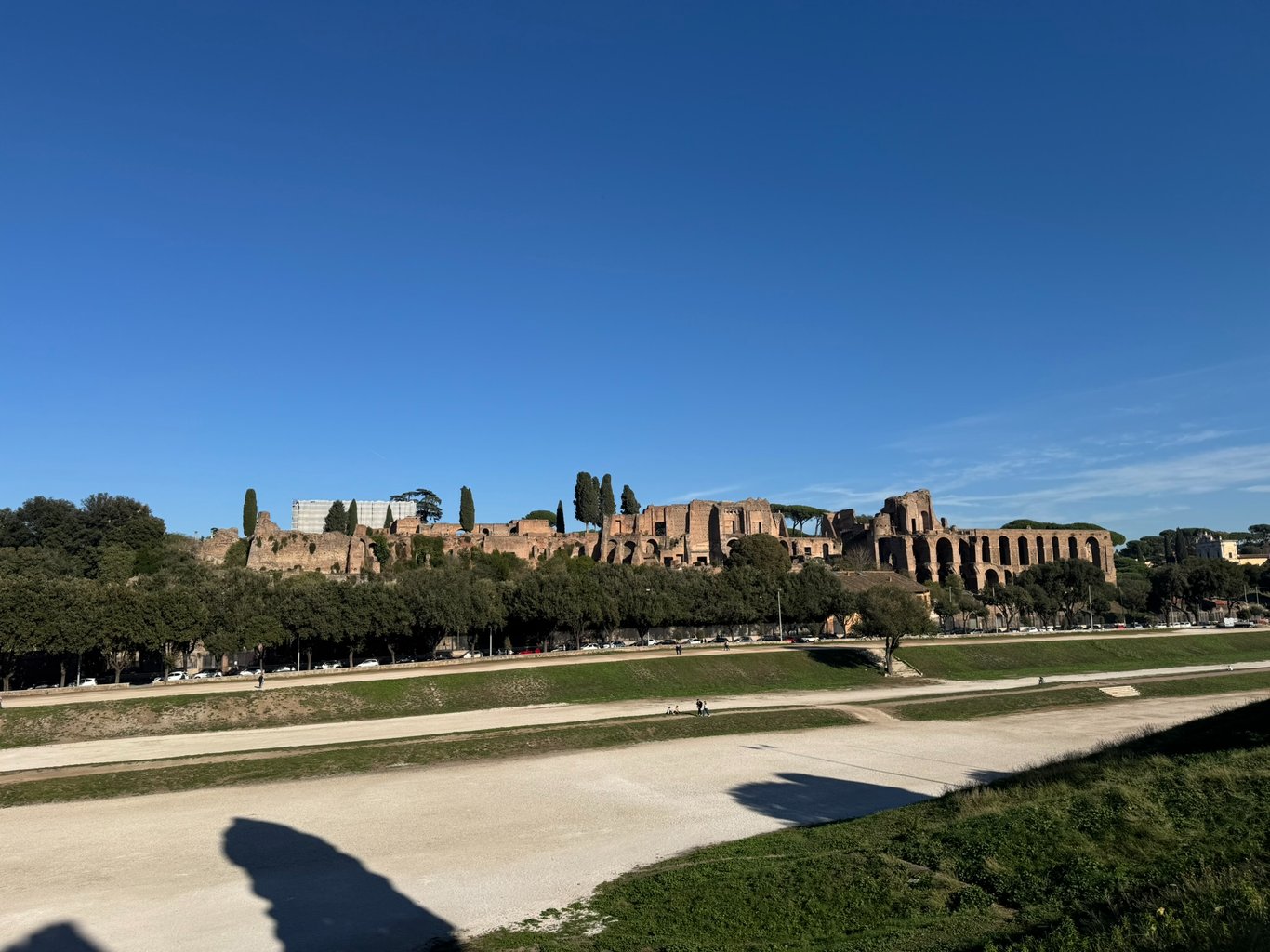 从梵蒂冈往南走啊走,就又回到了古罗马时代。画面下方那片宽阔的长条形平地就是古罗马最大的战车竞技场。现在看来也就啥也不是,大概不能算是个景点吧。远处的建筑是Palatine Hill上的皇宫遗迹。虽然说是皇宫,其实也就是剩下的地基和土堆了。只是站在远处去看,忽略细节的话似乎还能想象出一点点古罗马时代金碧辉煌的样子。