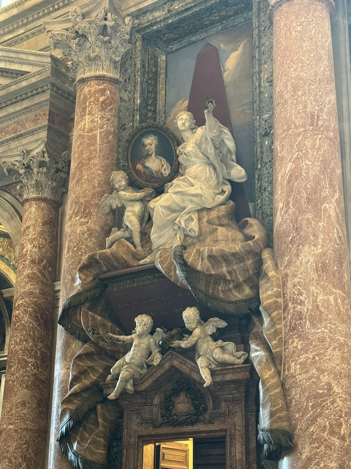 圣彼得大殿中埋葬的教宗很多,这是为数不多的世俗女性之一。玛利亚·克莱门蒂娜·索别斯卡是18世纪的波兰公主,她是一位非常虔诚的人,据说生活作风像一位修女。但是还是让人止不住好奇,欧洲的公主那么多,为什么只有她能在圣彼得大殿中拥有自己的位置呢?当时他嫁给了信仰天主教的斯图亚特家族,从而受到了罗马教廷的支持。在信仰新教的汉诺威王朝篡位英国王位后,教廷仍然承认信仰天主教的玛利亚的英国女王地位。问题是她的老公詹姆斯·斯图亚特为了让英国人支持他回去当国王,于是给了他们儿子一些新教教育,以作为政治上的妥协。然而作为虔诚天主教徒的玛利亚接受不了,她就跑到罗马的修道院以极端苦修的方式生活,并在32岁时早早死了。虽然说这是个悲剧,然而与教廷来说却是很好的宣传材料。这种宗教跟政治纠缠不清的文化我本人很难理解,你说宗教拯救的是灵魂吧,它又搞政治,你说他搞政治吧,它又跟你谈精神世界。要做好人就做好人,要做坏人就做坏人不行吗?