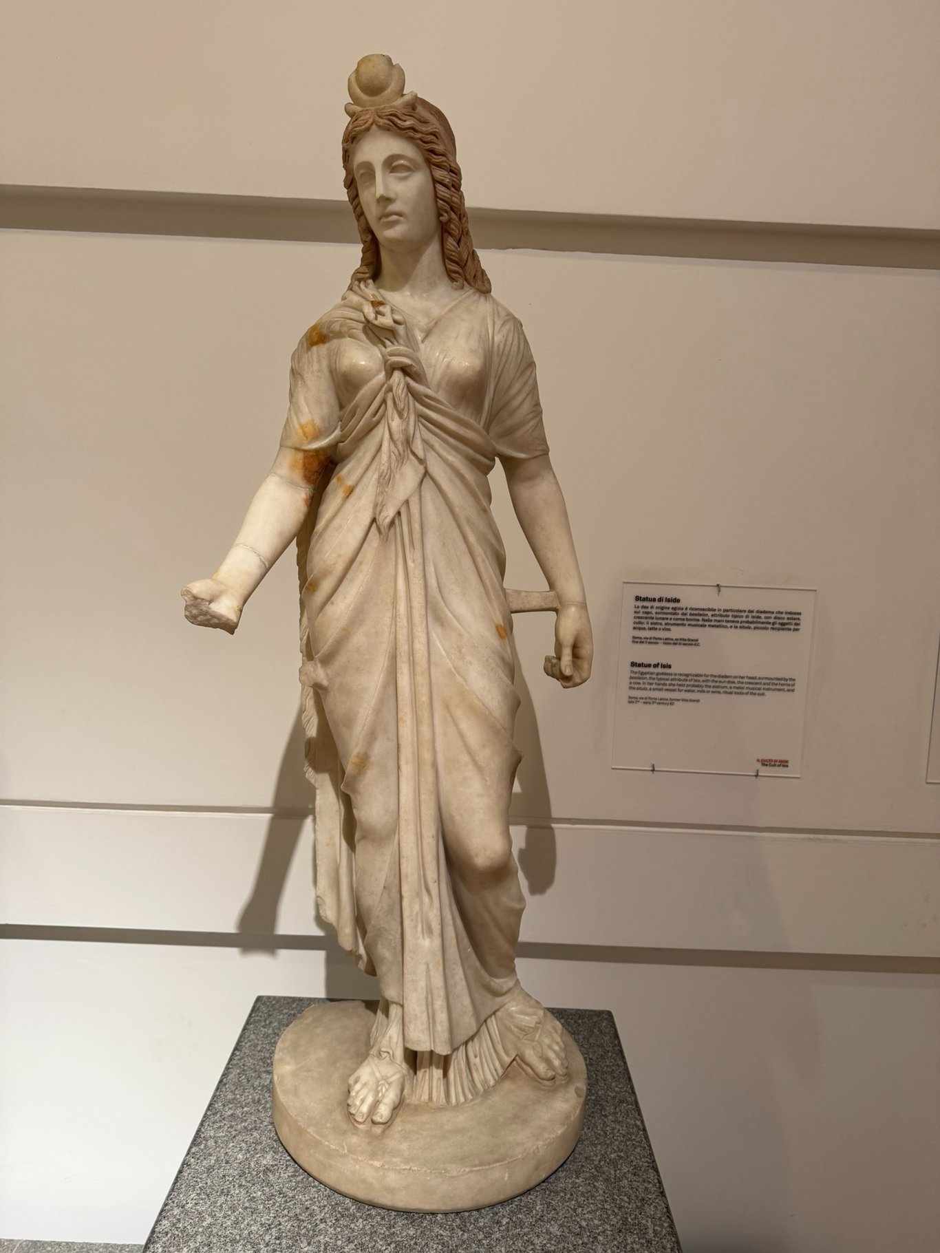 罗马对于伊西斯的崇拜就是从埃及引进的。起初作为一种神秘信仰,罗马人将她视为万能的女神,认为她既是海洋的保护神,也是自然、魔法和健康的守护者。25年9月在德国Mainz参加会议的时候,找时间去了当地的伊西斯祭祀遗迹。现在居然在罗马的中心重新找到了她。一位来自埃及的女神被罗马人接纳,被铸造成了栩栩如生的雕像,并随着帝国的影响被带到3000公里之外的北部边疆。不得不让人感慨罗马帝国当时的疆域之广大,文化之强盛。
