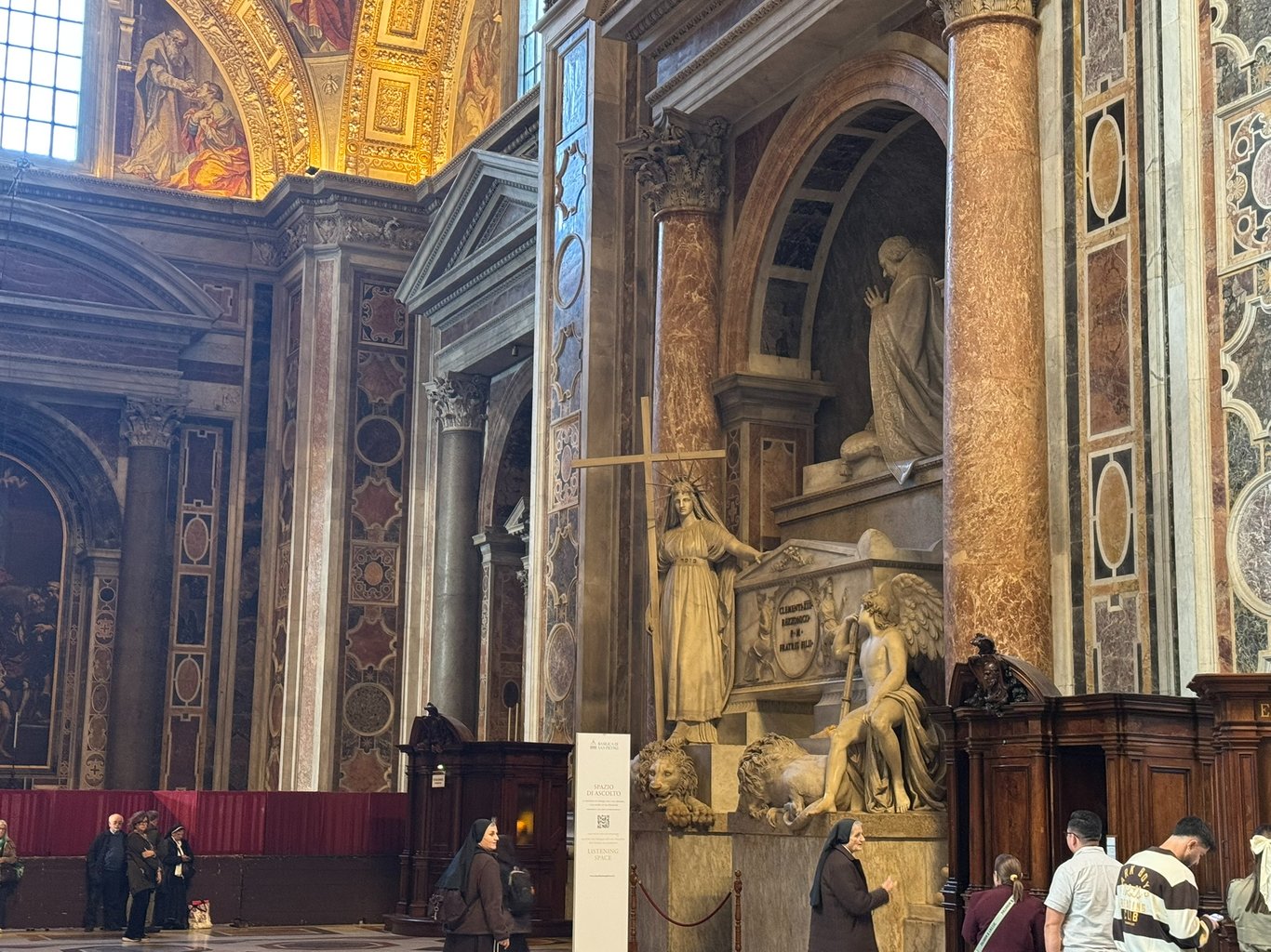 圣彼得大虽然说大部分由贝尼尼设计的巴洛克风格,这件雕塑是由18世纪的卡诺瓦设计的新古典主义雕塑。它褪去了巴洛克式的感官刺激,重新恢复了简洁与庄严的美感。最让人注目的是女性手中纤细笔直的十字架,与华盖扭曲的巴洛克柱子形成了鲜明对比。它带来的是一种冷静简洁的感觉,一种最原始的虔诚。这个地方被围栏围着,前面的人也比较少,挺符合新古典审美的。