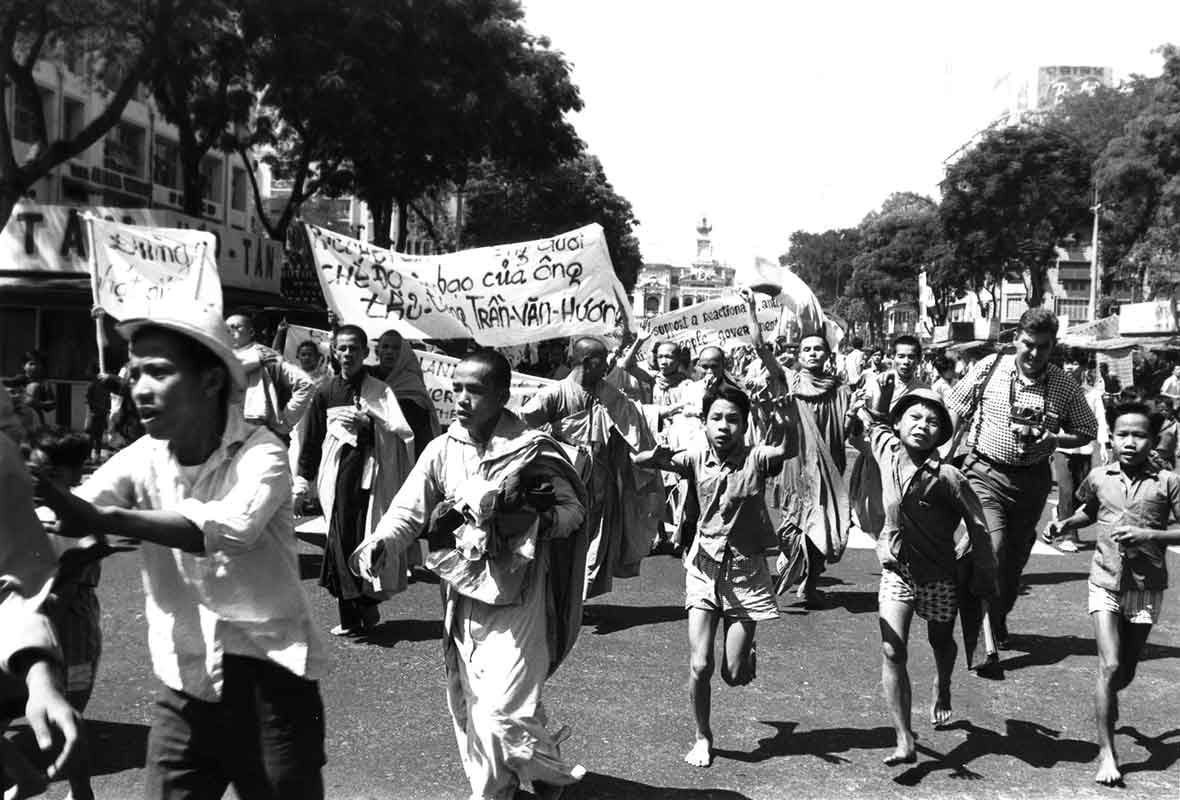 1966年5月31日,越南禅师释一行与马丁·路德·金举行联合新闻发布会,呼吁结束越南战争。一行禅师在会上阐述了“入世佛教(Engaged Buddhism)”的理念,强调佛教修行不应止于个人解脱,而应介入社会、政治与历史现实,主动反抗不公义的制度。