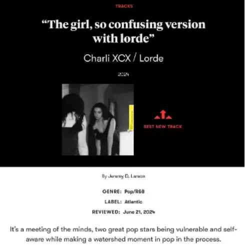 Charli xcx 联手 Lorde 混音单曲 The girl, so confusing version with lorde 荣获 Pitchfork 的 Best New Track 认证。“这是两位伟大的pop stars在思想上的交流碰撞。他们展现出脆弱和自省的一面,同时也创造了流行音乐史上的一个分水岭时刻。”
