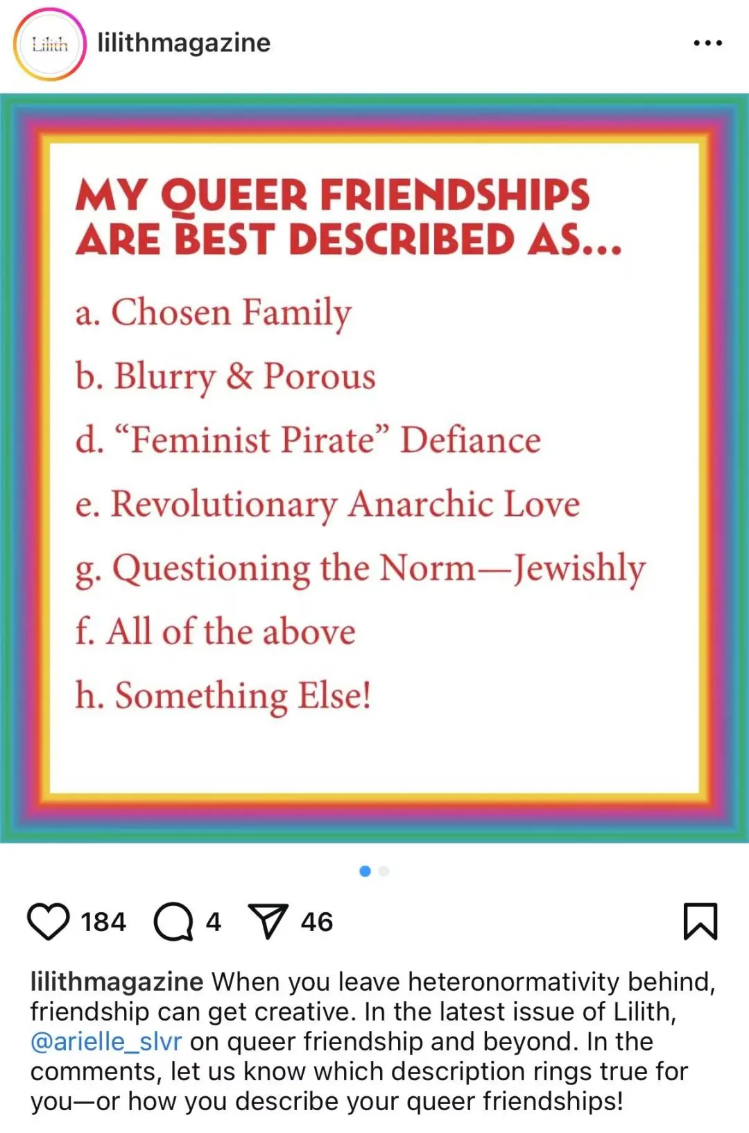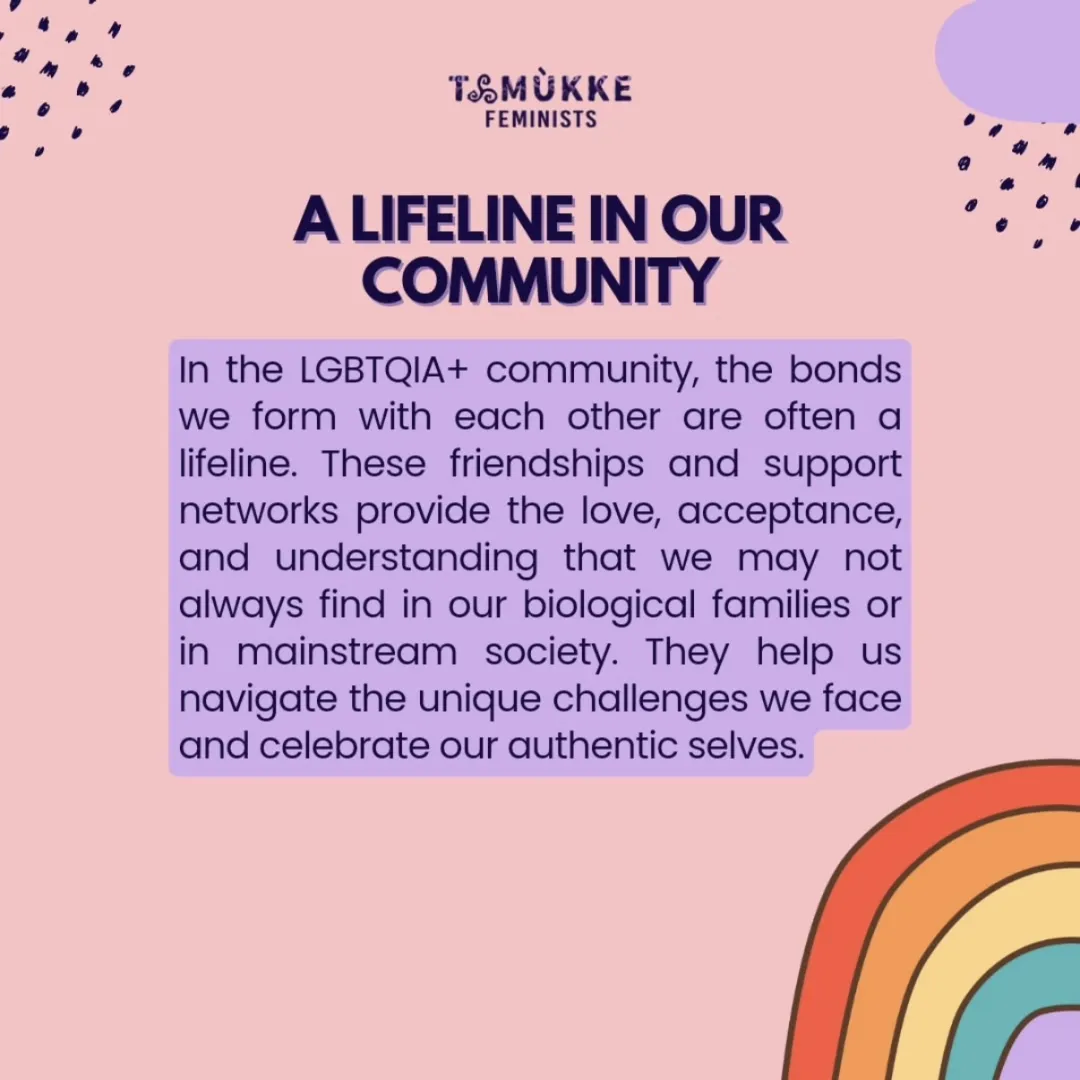 "在LGBTQIA+群体中,我们彼此之间建立的纽带,往往是一种生命线。这些友谊和支持网络给予我们爱、接纳与理解——那些在原生家庭或主流社会中未必能轻易获得的东西。它们陪伴我们走过独特的挑战,也一起庆祝我们真实的自我。"图源Instagram @tamukkefeminists