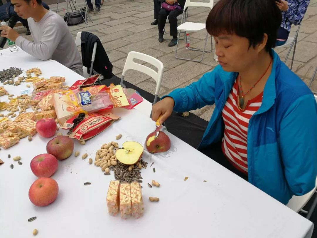 《D民手案》现场 另一位失去手臂的工伤工友在论坛现场“削平果” 照片由艺术家提供