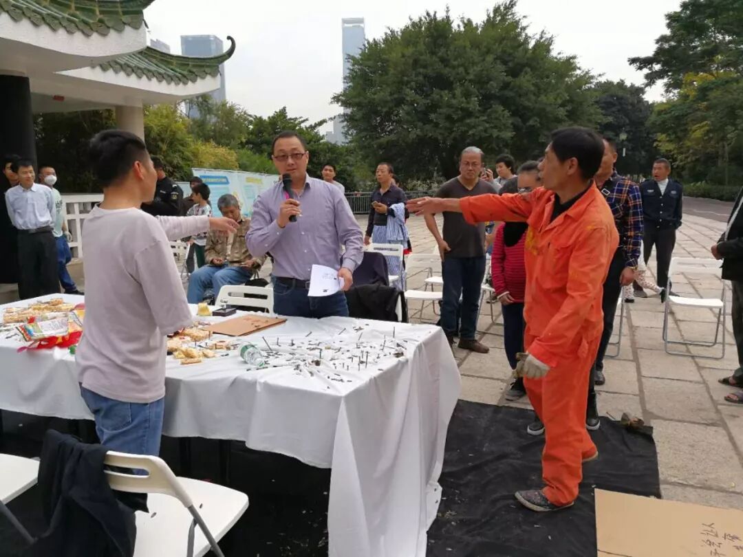我邀请了一位律师、两位工伤工友及民间公益组织负责人。三方均为现实中的真实人物。另外,我又邀请了六位在深圳打工的工人参与,他们是现场行为艺术的主要表演者。前期,我对三方人物做了两个月的调查、采访和沟通。由于没有设定表演内容,我们没有任何剧本和排练,直接上台。我设置了健身教练20分钟塑造手臂肌肉的健身课。一名工人一直在用电钻凿一块混凝土,最终从里面凿出一支硅胶手臂模型。一位美甲师前去将硅胶手指甲做豪华美甲。这一系列的行为艺术都成为中心讨论的背景和干扰因素,犹如此场域以外的片段式的信息提示和话语的袭击。这些构成一个各司其职的并置的工作场域。这个场面让很多公园的民众驻足并进入到讨论中来,有关法权是否平等的话语冲突在这个公共空间自然的发生了,“剧场”逐渐的融化和消失于这个公园的下午时空中。后面,我基本上放弃了对这个剧场的任何话语的控制而让其放任自流。