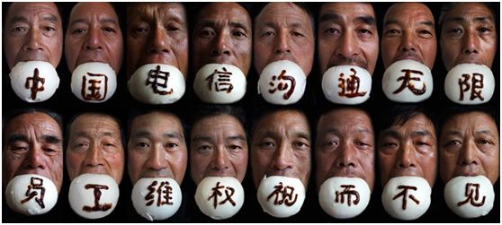 我选择介入了一个关于工人的事件,陕西省商洛有56位工人起诉了中国电信陕西省分公司无故剥夺了他们退休后的养老保障。在中国,国字头的企业的董事长是政府。这个诉讼的核心是电信公司为了摆脱工人退休保障,私自为员工注册了工商个体营业执照。如此,工人和公司就变成了合作关系。整个陕西省无故清退工作了几十年的老工人有数千人,这数千名工人中有这56位工人起来抗争。这批老无所依的工人踏上长达十年的上访之路,至今未果。中国电信是国家资本的产物,这些工人面对的已经不是资本家那么简单。中国绝大多数媒体因为拥有中国电信的广告业务而被消声。当地法律援助的律师告诉他们,在中国,起诉中国电信的官司还没有赢的。法律援助之路被堵死。社会制度制造了千万的权利难民,他们在这个社会中没有任何权力机构可依托,十年间到各个上级部门上访、申诉,茫然而绝望地寻求一个公正的判决。