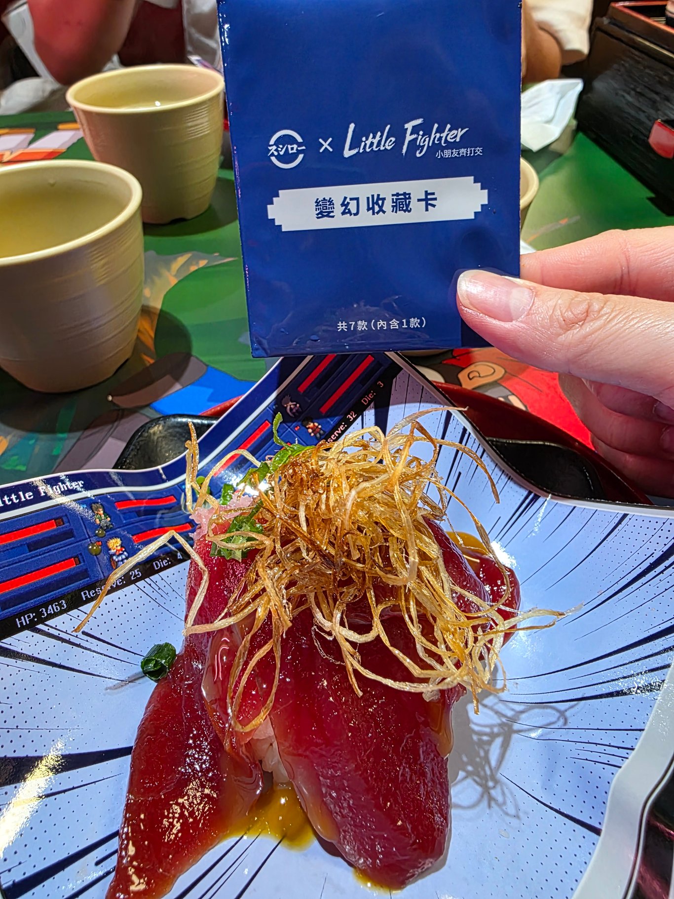 每一張桌子也是滿滿的遊戲場景,店員也穿着主題服裝,聯乘的產品也很便宜,基本上你點指定食物就有抽卡活動,吃幾個我相信也不會太飽,所以要儲一套應該不困難,但我還是選擇吃點別的🤣。