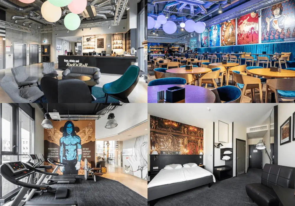 飯店外觀及公共空間設計時尚。具有未來感的藍色調點綴各式螢光色,配上美式漫畫風格畫作,營造搖滾樂氛圍。