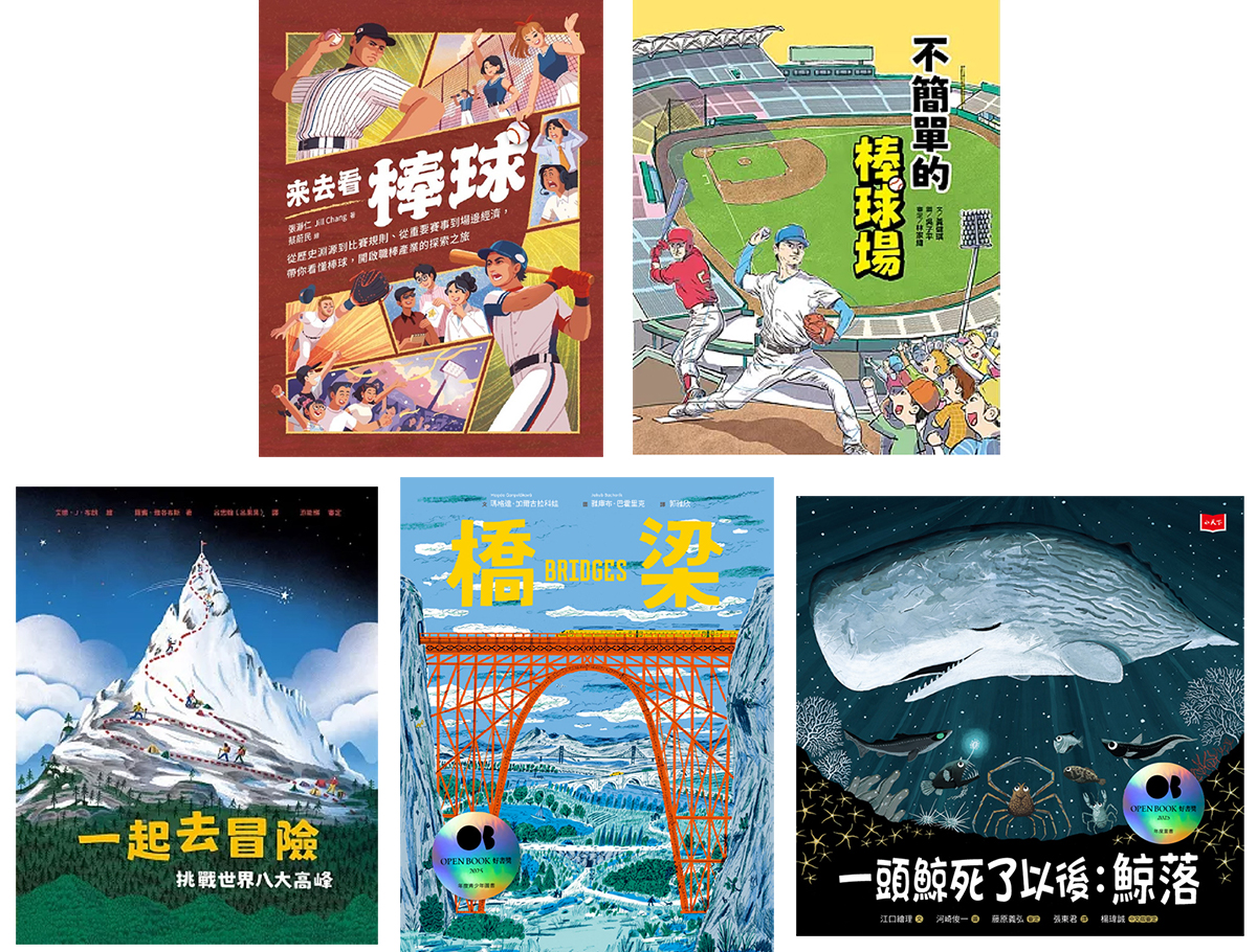 《來去看棒球》和《這裡不簡單1:不簡單的棒球場》彙整出棒球運動及棒球場的細節,《一起去冒險》記錄挑戰世界八大高峰的地理景觀和冒險歷史,《橋梁》精細探索各種有形及無形的橋樑生成意義,《一頭鯨死了以後:鯨落》看深海生物的生存鏈結。