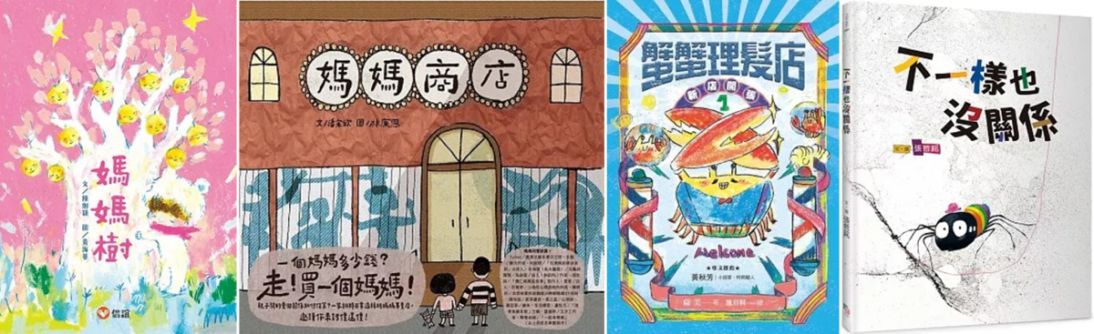 《媽媽樹》中小妖精渴望有媽媽的愛,神奇的許願成真具有古典童話的溫馨氛圍。《媽媽商店》充滿荒謬奇趣,任小孩把媽媽賣掉,顛覆了大人/小孩間的權力關係。《蟹蟹理髮店1:新店開張》則寫活蟹先生新開設理髮店的日常故事,妙趣橫生。《不一樣也沒關係》討論自我認同,是這幾年童書和青少年圖書常見的題材。
