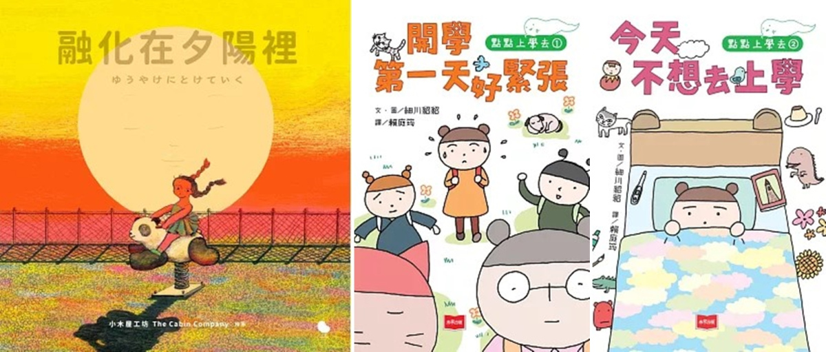 《融化在夕陽裡》有小孩融入夕陽中的不同心境映照。橋梁書《點點上學去1:開學第一天好緊張》、《點點上學去2:今天不想去上學》亦捕捉每個小孩在學校的情緒和行為。綜觀以上作品,可以感受到,幫助孩子建立情緒素養的社會情緒學習(Social and Emotional Learning,簡稱SEL),相關童書已然是市場的主流。