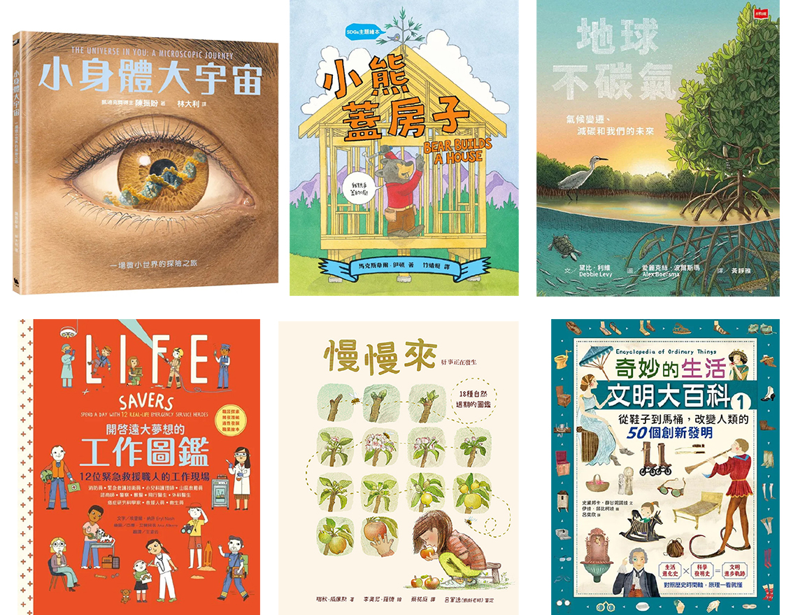 《小身體大宇宙》由微小的分子擴延觀看宇宙的聚合形滅,《小熊蓋房子》引入太陽能發電等永續議題,《地球不碳氣》思考碳排放與地球永續,《開啟遠大夢想的工作圖鑑》向12個急難救援相關的偉大工作致意,《慢慢來:好事正在發生》揭示自然界中諸多生命的形成需要的時間,《奇妙的生活文明大百科》圖文並茂的展示了文明生活物件的演進。