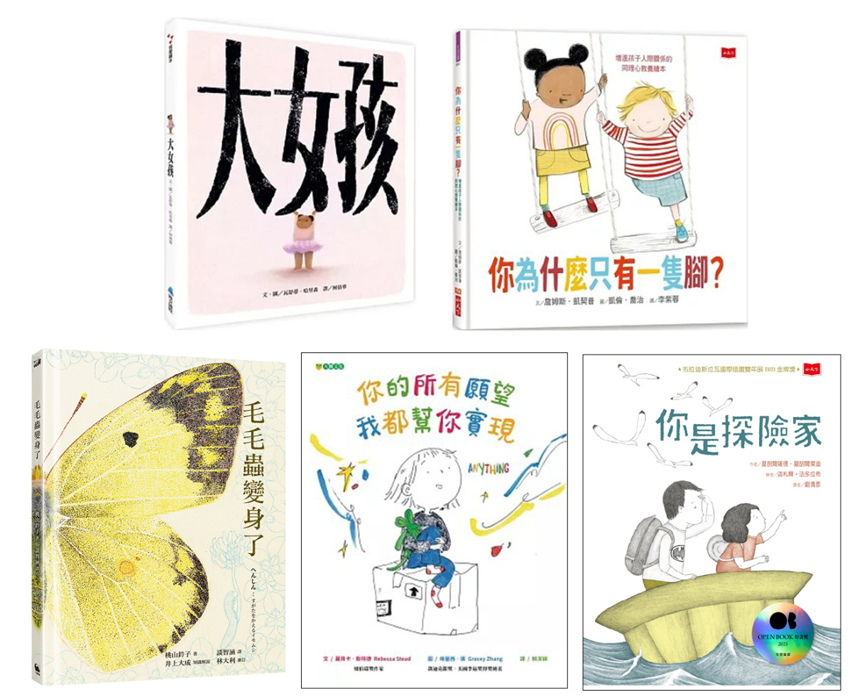 《大女孩》勇敢消泯對外表的偏見歧視,《你為什麼只有一隻腳?》關懷有身心障礙的孩子,讓身體的缺陷不再是心理的困擾。《毛毛蟲變身了》描繪四種蝴蝶的蛻變歷程,可以和《蝴蝶之旅》互相參看。《你的所有願望我都幫你實現》有感人的父女親情互動,細探單親女兒搬家的不安心情轉折。《你是探險家》同樣細膩的探究兒童面臨戰爭衝擊的情緒變化。