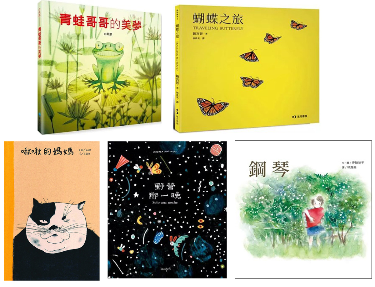 白希那(백희나)《青蛙哥哥的美夢》帶有動畫鏡頭的表現語言;同是白希那的作品,《啾啾的媽媽》又是另一種畫風,母貓胖妮的情感動作姿態都被詮釋得生動有層次。安德烈.安提諾利(Andrea Antinori)的無字繪本《野營那一晚》,熱鬧歡樂的敘說一名男子在深山野營一晚,遭遇的種種超現實奇遇。新宮晉的《蝴蝶之旅》是帝王斑蝶壯闊的生命追尋,伊勢英子《鋼琴》所追尋的則是音樂的動人聲韻。