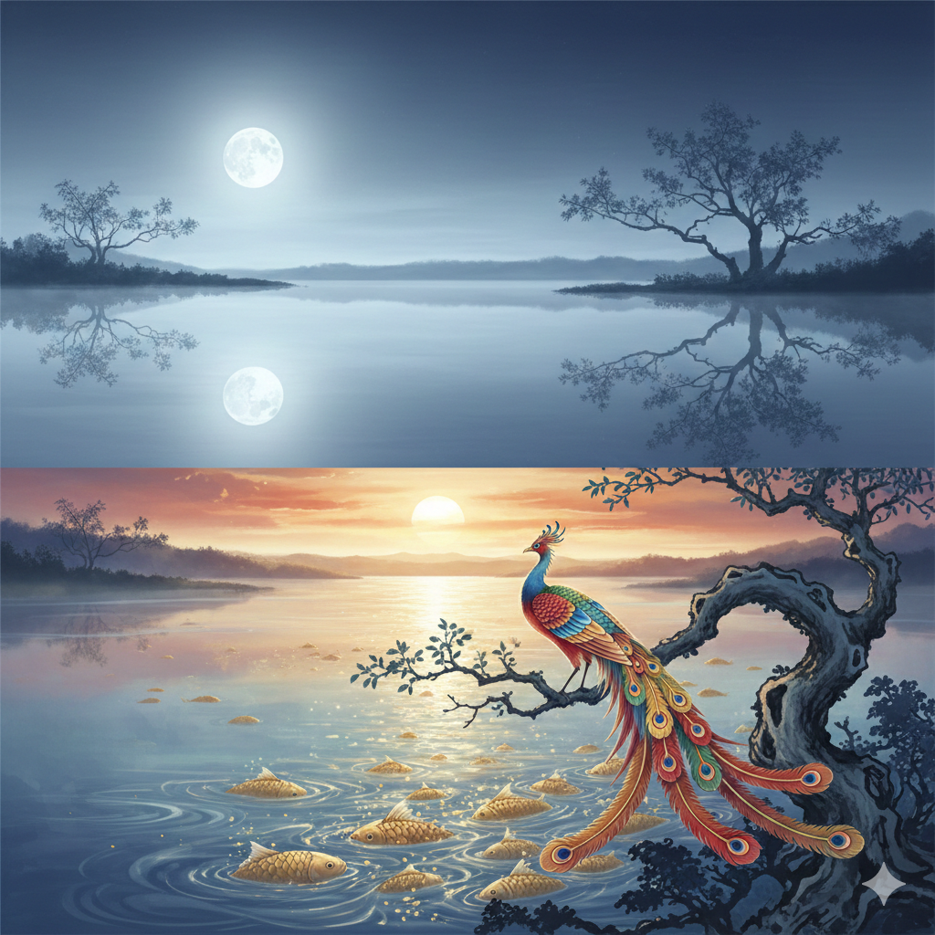Symbolism: Classical imagery, like the "jade mirror" (玉镜) symbolizing purity, the "phoenix" (彩凤) representing good fortune, and "golden scales" (金鳞) for success, are deeply embedded.