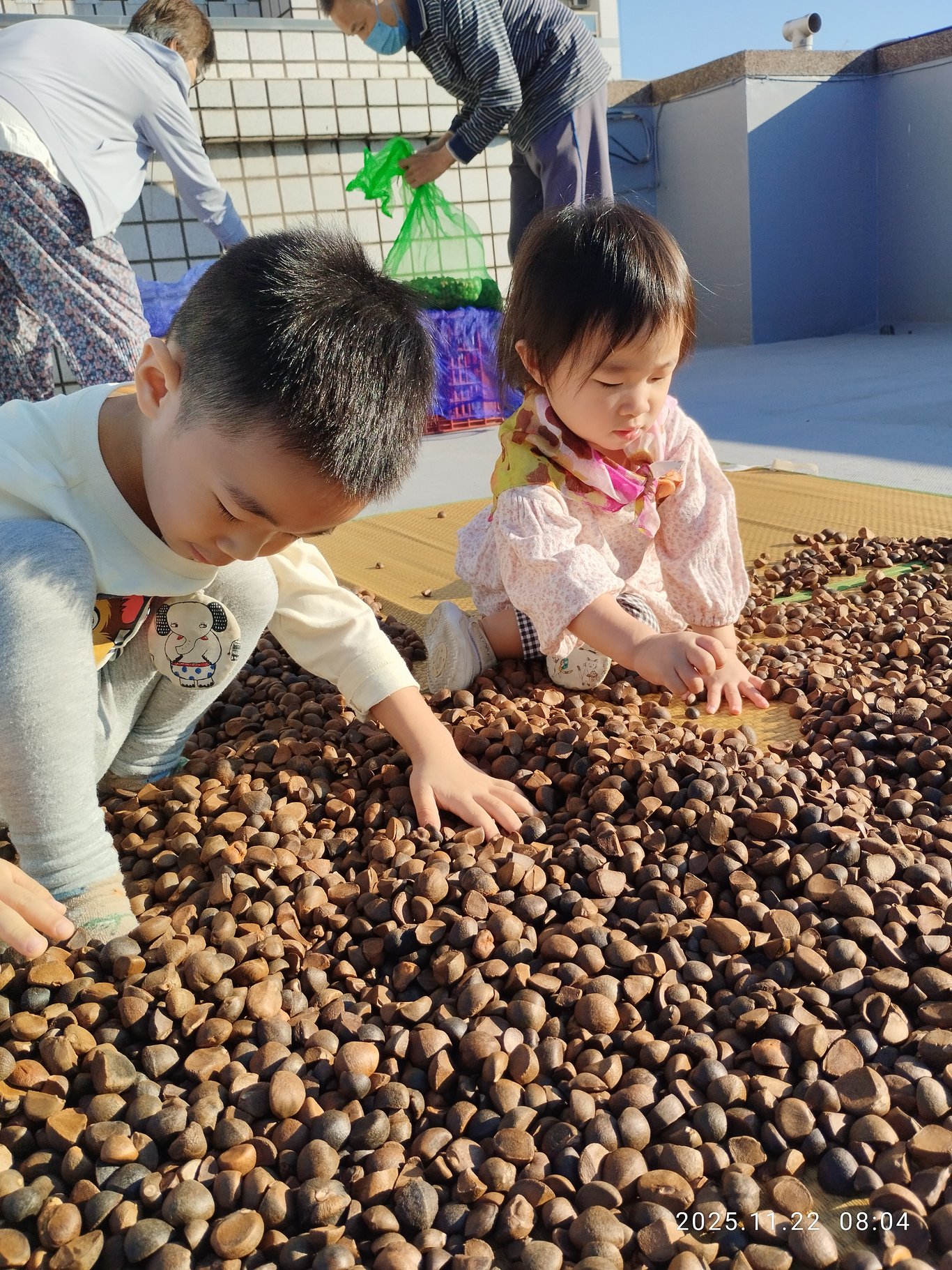 日曬是最古老也是最辛苦的工法,苦茶籽收成在冬季,冬天的太陽溫暖而不烈,帶著小小孩一起曬茶籽、身體也一起曬曬太陽,看著他們輕輕撫抹著茶籽小baby,日曬反而變成是一種幸福滋味而不是辛苦,豈不樂哉~
