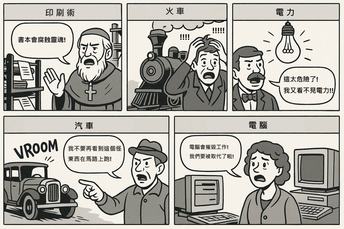 其實,對於新事物的第一反應往往是好奇或恐懼。AI 的聰明與不可控,更放大了這種矛盾情緒。但歷史告訴我們:每當新科技出現,人類總會有類似的擔憂。接下來,我想和大家聊聊歷史上的“科技恐懼時刻”,看看我們曾如何面對未知。