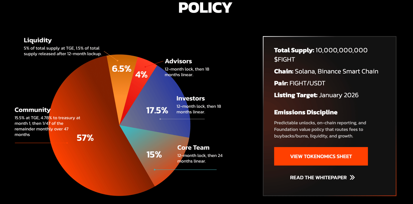 治理层面,$FIGHT 持有者可以投票决定国库分配、排放计划、生态拨款等。所有效用场景产生的收入都会流入 DAO 国库,用于生态支持和增长。