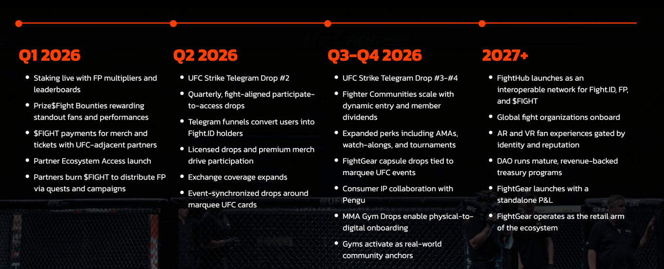 Q3-Q4 2026:Fighter Communities 规模化(动态入场价+成员分红)、FightGear 服装联名、MMA 线下健身房合作落地。这是生态能否从线上延伸到线下的关键期。