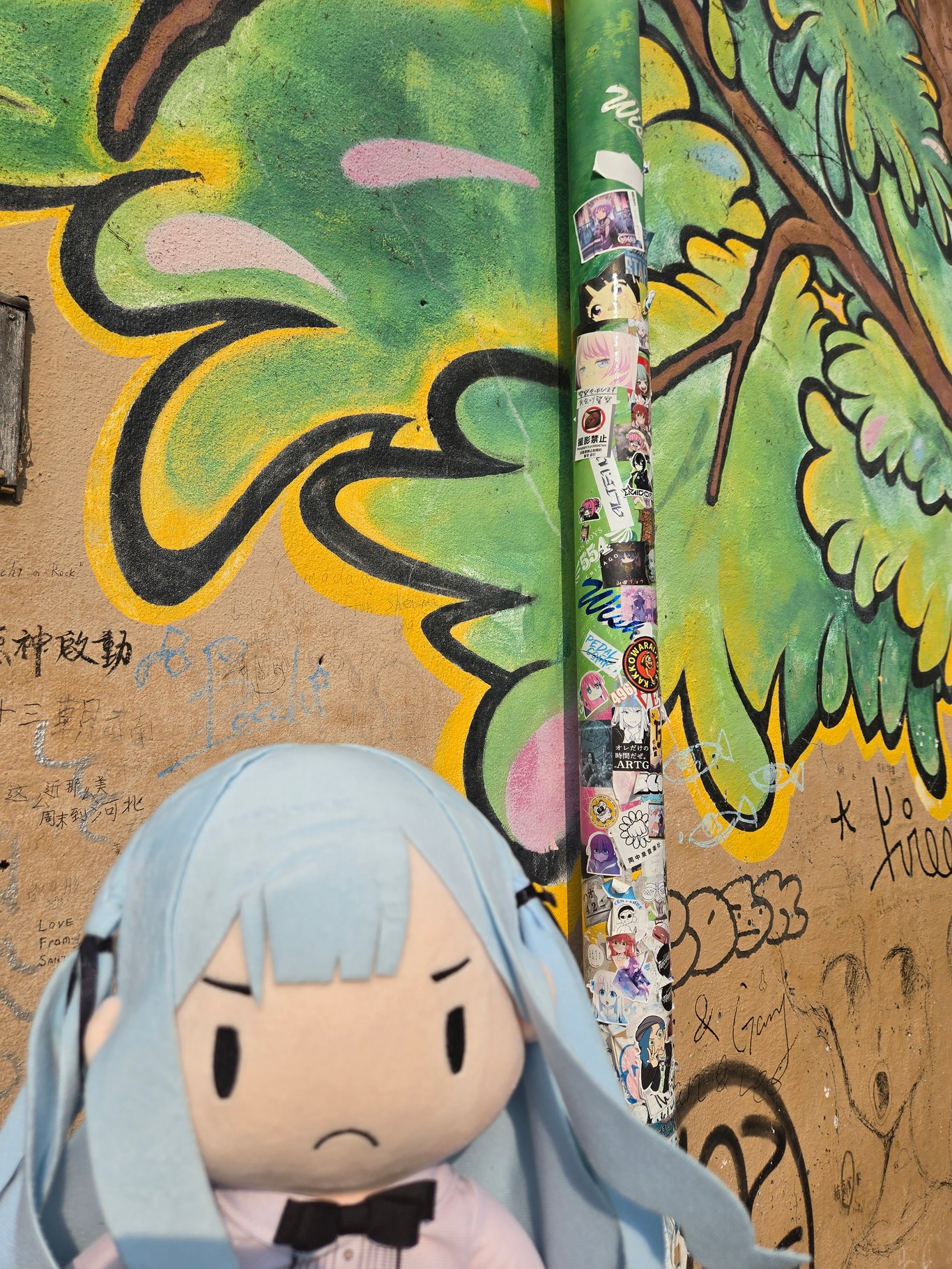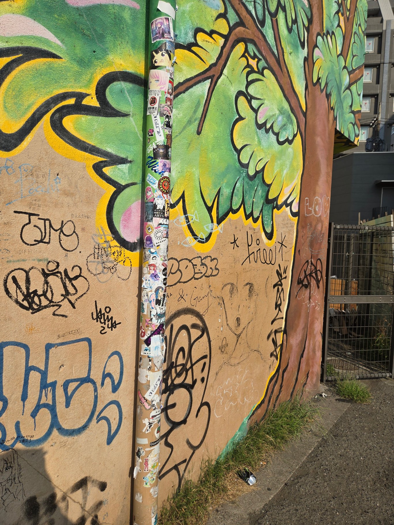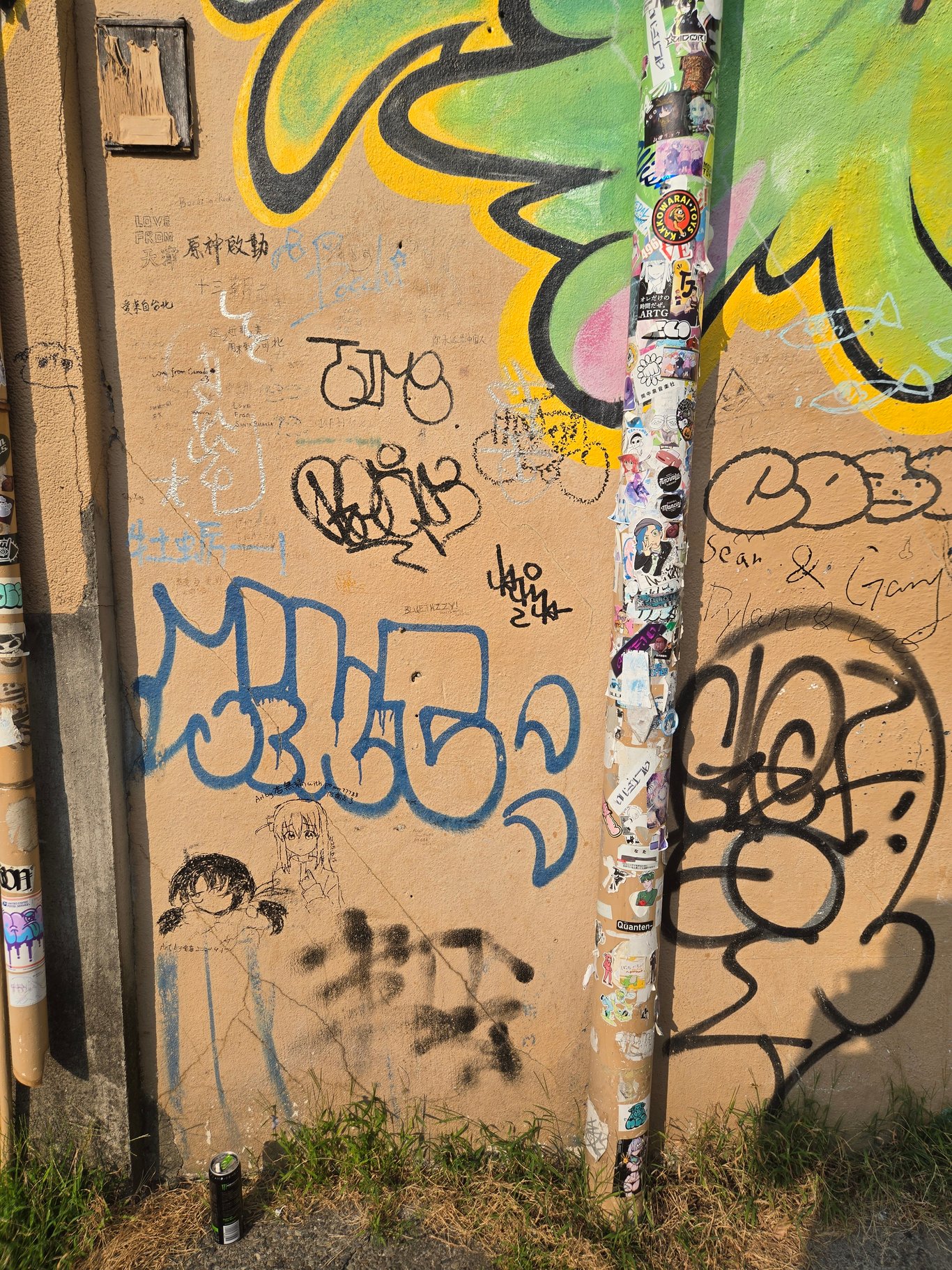 第一个去打卡的地方,当然就是EP4的结束乐队合影墙——这里人是真的多。合影墙边上有一个停车场,本体建筑我没注意到是干什么的。很多人在这里打卡拍照,所以你需要排队。我看了下,管子上贴满了贴纸,墙上也有涂鸦。很多贴纸一看就是老中贴的抽象贴纸,展现了老中的非凡创造力,我很后悔没自己带贴纸过来贴。