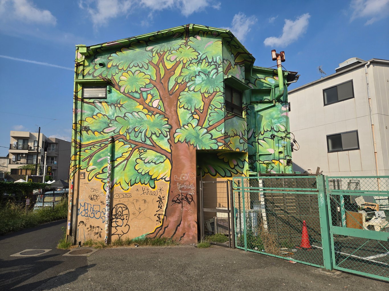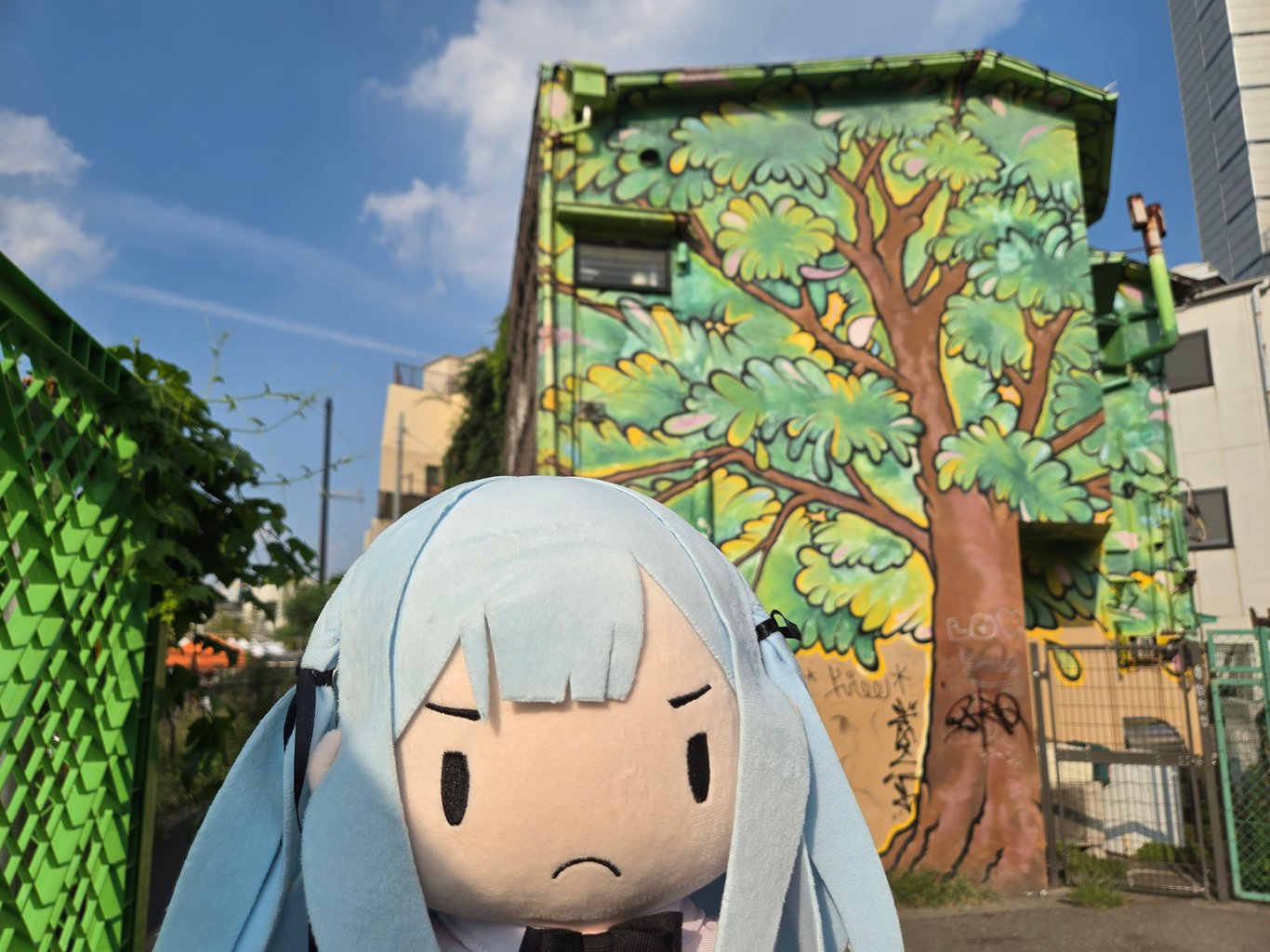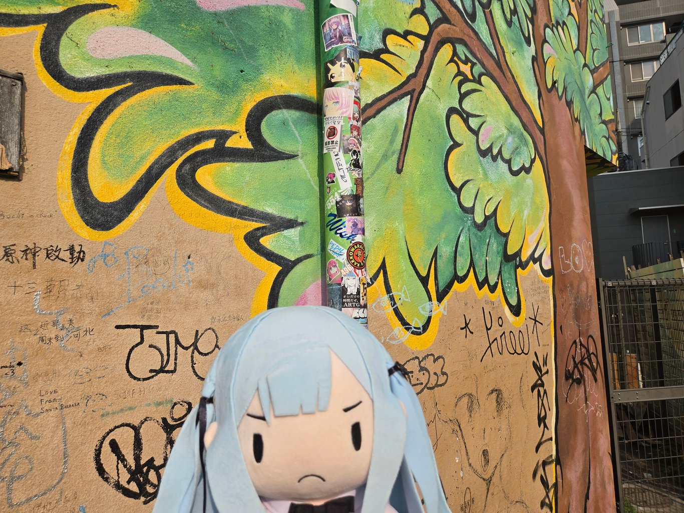 第一个去打卡的地方,当然就是EP4的结束乐队合影墙——这里人是真的多。合影墙边上有一个停车场,本体建筑我没注意到是干什么的。很多人在这里打卡拍照,所以你需要排队。我看了下,管子上贴满了贴纸,墙上也有涂鸦。很多贴纸一看就是老中贴的抽象贴纸,展现了老中的非凡创造力,我很后悔没自己带贴纸过来贴。