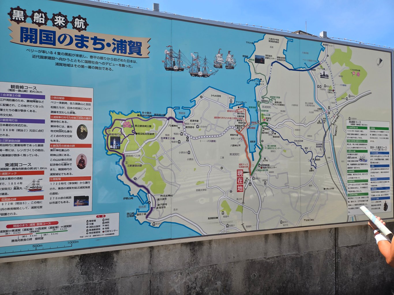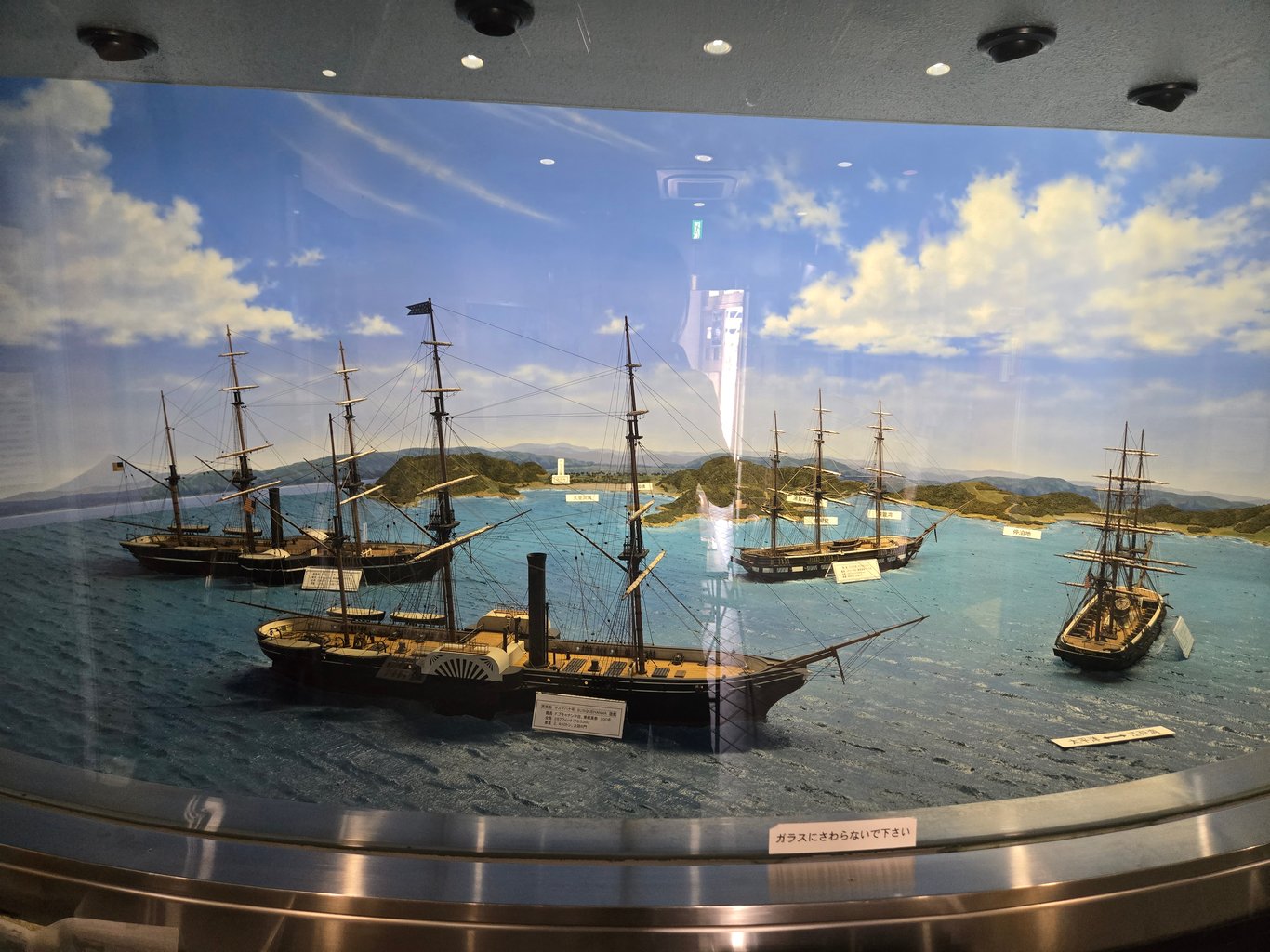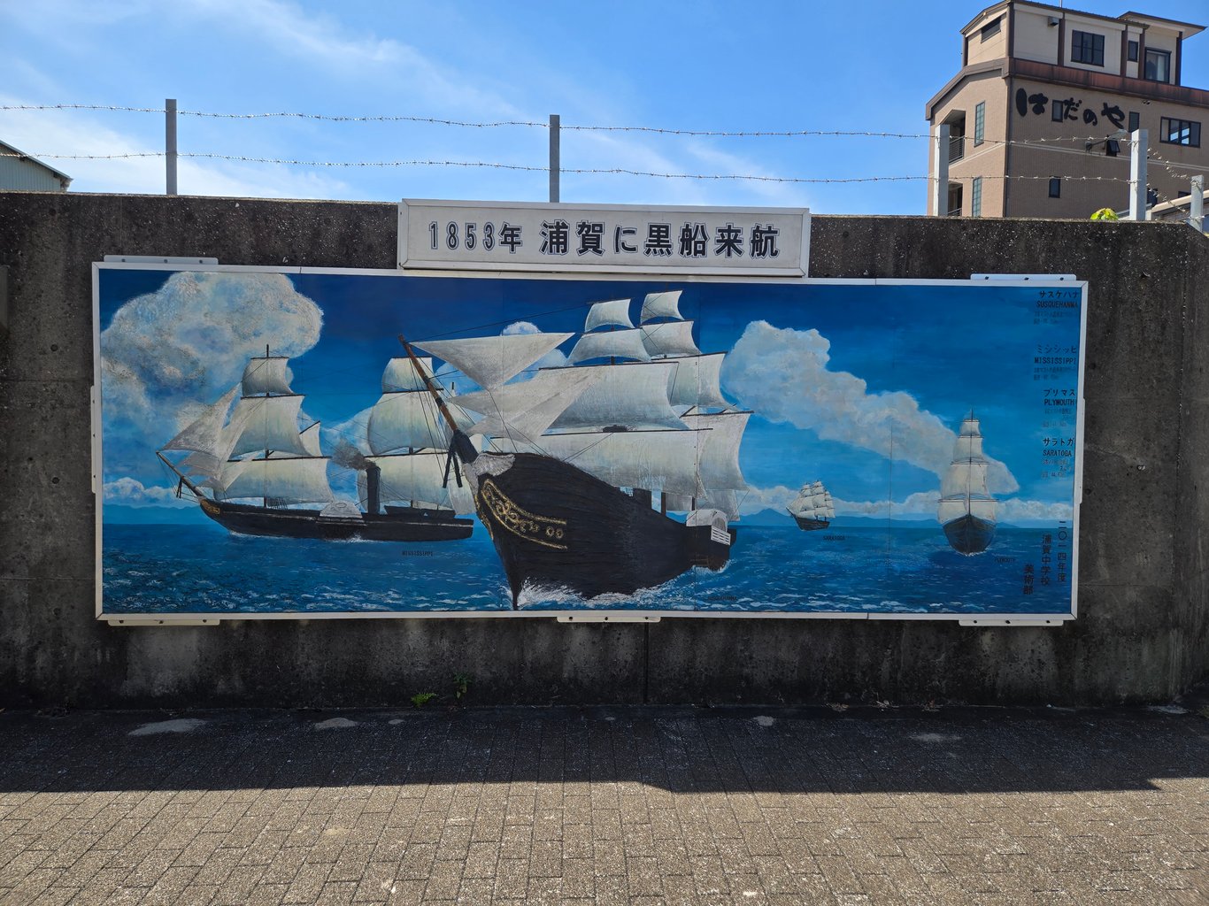 8月23日周六,那天是处暑,但天气并没有很热。看着晴天不错,心想去海边走走。想到浦贺还没有去过,就在上午抵达。到的时候还太早,浦贺站前一片荒凉。站对面的墙上就是黑船,黑船和佩里已经是浦贺本地的文化标志了。