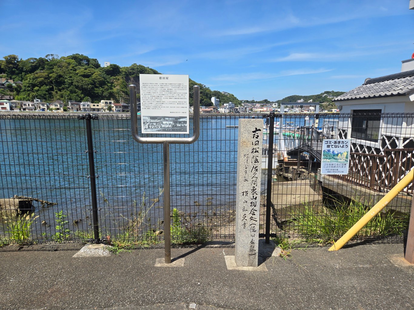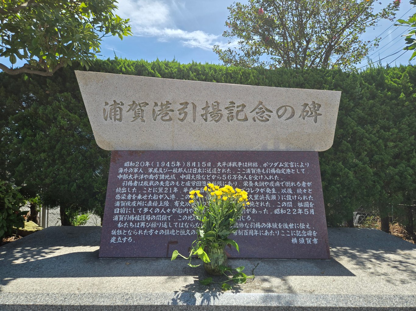 浦贺湾西侧,有一个码头,地图上标记有陆军栈桥。这里历史悠久,也是江户时代就有海防机构了。二战战败后,几十万被遣返的日军和日侨曾在这个栈桥登陆,一度死伤惨重,因此有一个小纪念碑。