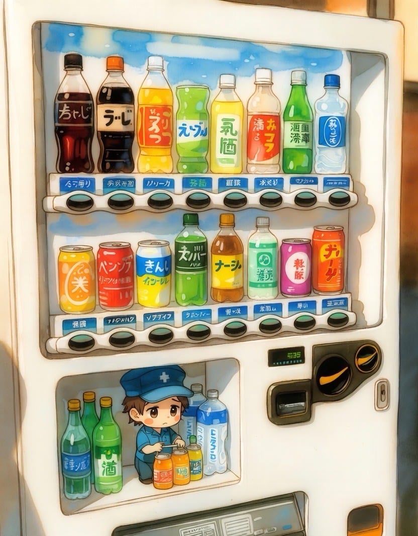 我的外觀,正是你所見到的樣子:雪白色的鐵皮外殼,像一座方正的移動冰箱,肚子裡裝滿了五顏六色、名字誘人的冰涼飲品。最上面兩層是塑膠瓶裝的,有沉穩的深棕色「ちゃじ」和「ラーじ」(也許是茶和拉麵汽水的混合?),也有陽光般閃耀的黃色「えっり」(能量飲料吧),還有那帶著清爽氣泡的「気泡」。下面兩層是罐裝飲料,橘色、紅色、藍色、綠色,像是被冰鎮住的彩虹,每一罐都承載著解除暑熱的使命。