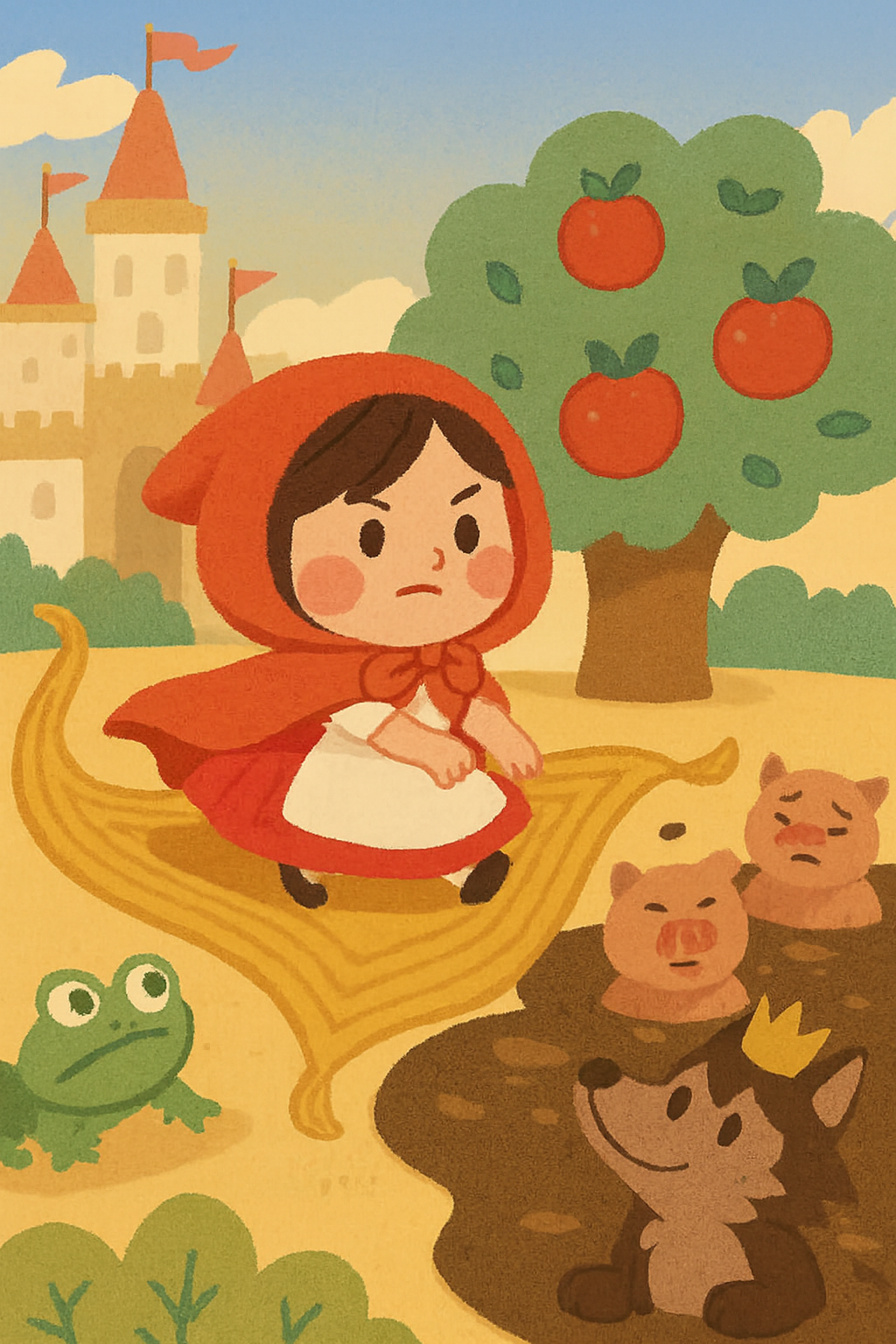 旁白:從前從前,有一個國家住著一位天真可愛的小公主,她叫「小紅帽」。有一天她偷聽到侍臣說的話……