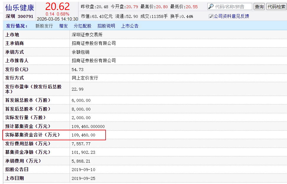 仙乐健康当年创业板上市,发行价54.73元/股。融资10.95亿。
