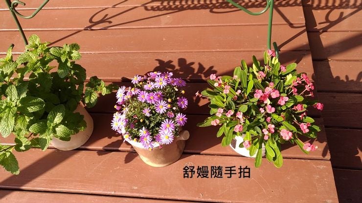 薄荷,中間盆栽的植物是姬小菊(或稱絲河菊),和麒麟花。