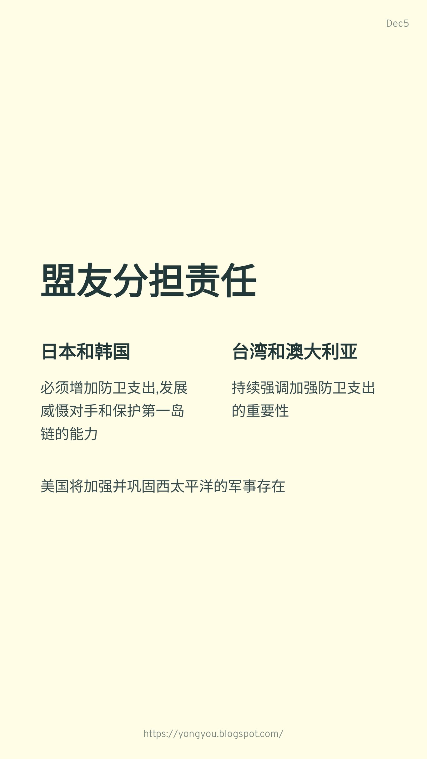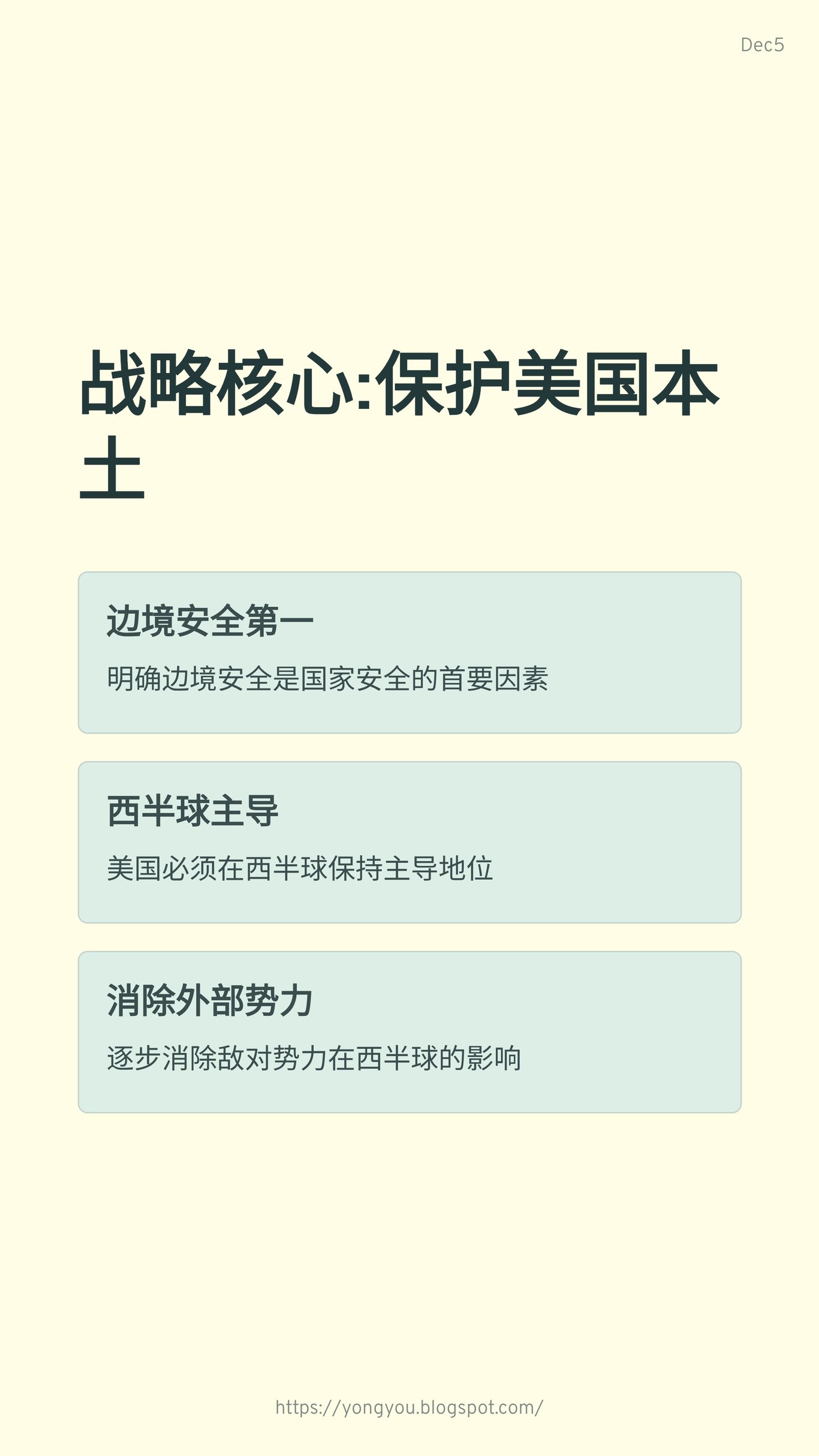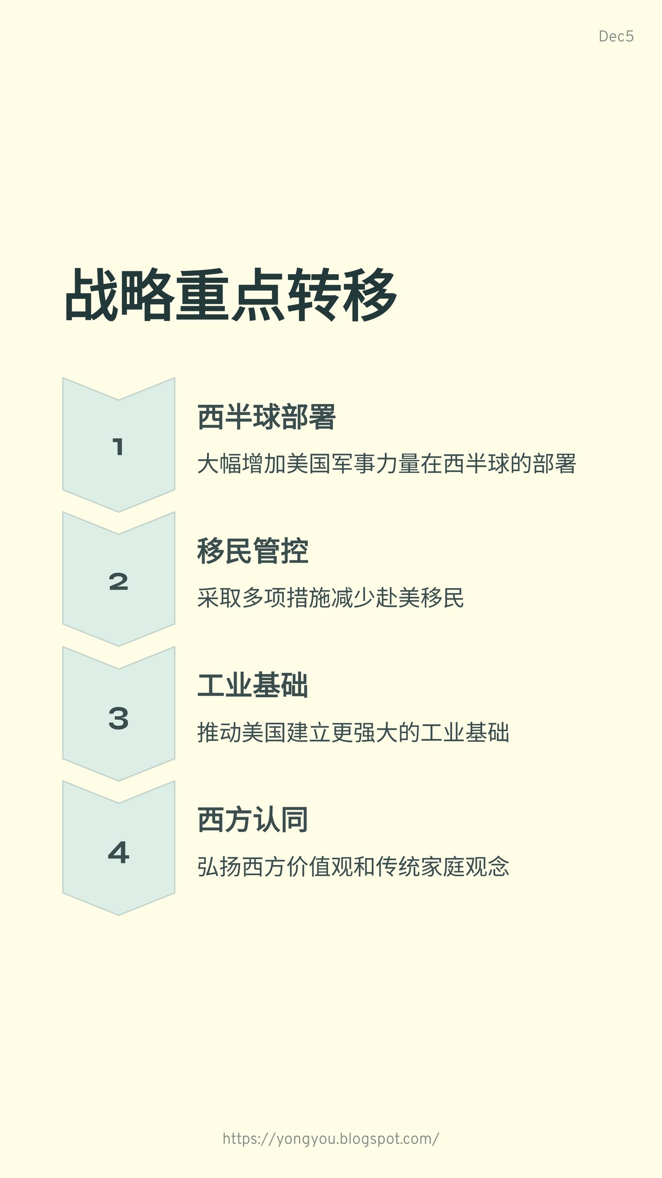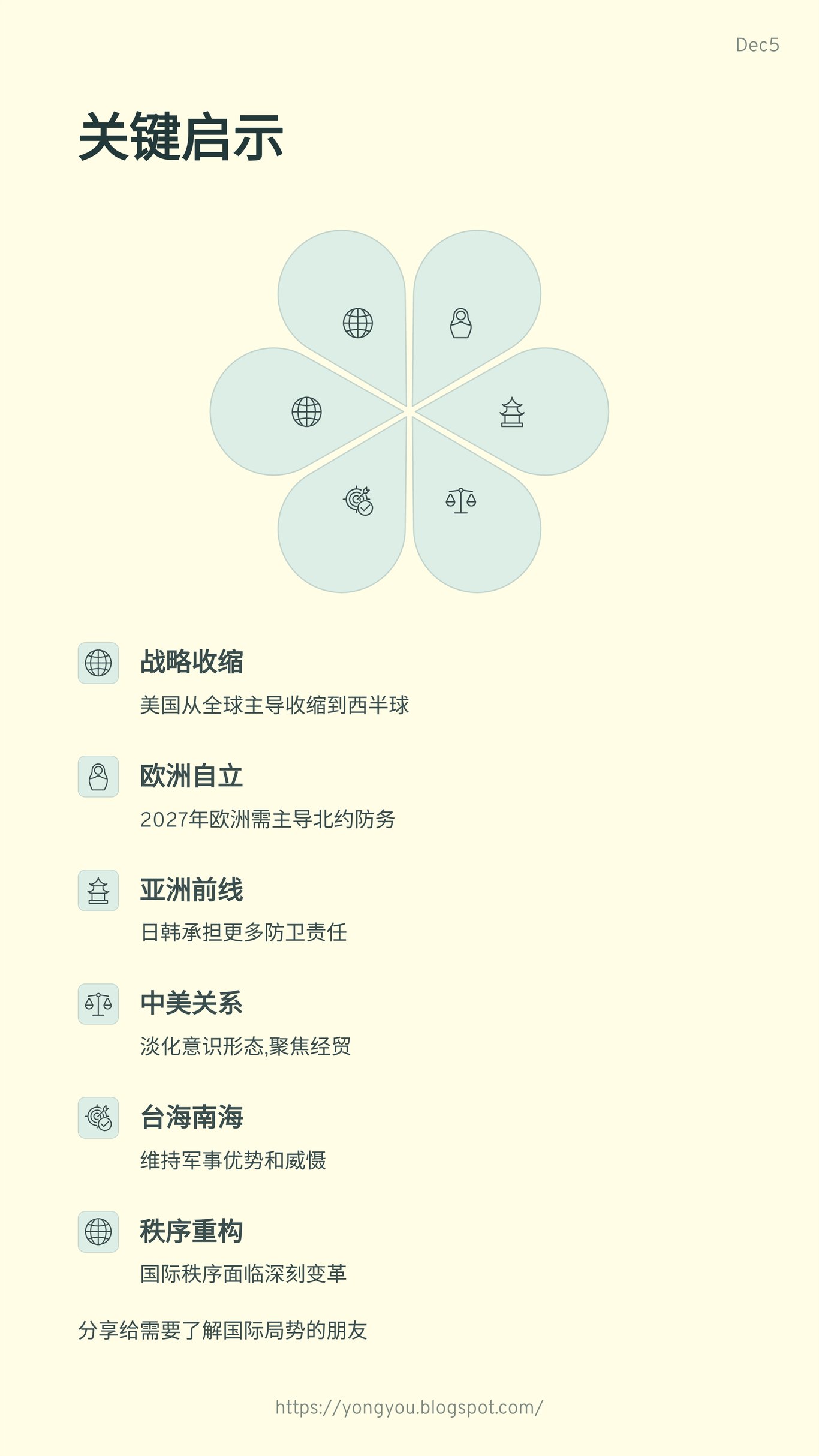 本文将深度解析这份战略报告的核心内容、其对欧美同盟的冲击、对中美关系的微妙重构,以及这一战略转向背后的深层逻辑。---## 一、 战略核心转向:本土优先与西半球主导经历了11个月的酝酿与推迟,川普政府终于向世界摊出了底牌。这份长达33页的文件,开篇即确立了美国新安全观的基石——**保护本土安全**。与过去几十年强调全球力量投射不同,新战略明确指出:边境安全是国家安全的首要因素,而美国必须在**西半球**保持绝对的主导地位。这一表述是对以往“美国作为世界警察”角色的根本性修正。文件直言不讳地指出,冷战后外交精英们关于“美国永久主导全球”的信念是错误的。川普政府划定了一条新的红线:**只有当国家行为直接威胁到美国利益时,其事务才与美国相关。** 这意味着,美国将主动放弃相当一部分战后长期主导的全球事务,转而通过收缩战略资源来巩固后院。副总统万斯(JD Vance)在社交媒体上的言论为这一战略做了最直白的注脚。他表示,美军不应在世界各地执行“不可能的任务”,华盛顿的底线是动用军队摧毁属于西半球的毒品恐怖分子。这标志着美军的管辖范围被重新定义为北美、南美及其周边水域。此外,该战略还注入了浓厚的意识形态色彩,不仅强调减少移民、建立强大的工业基础,更罕见地提及“恢复基督教右翼传统价值观”,呼吁通过传统的家庭结构来“复兴美国的精神”。这一系列举措表明,川普试图通过“内圣外王”的方式——即通过内部的文化与工业重整,以及外部的战略收缩,来确保美国作为“地球上自由家园”的地位。## 二、 欧洲的至暗时刻:北约防务移交与对俄战略缓和如果说新战略对西半球是“强化控制”,那么对欧洲则是“严厉通牒”。《华尔街日报》评论称,这份文件将矛头直指欧洲,其批评之严厉、态度之直白,可谓前所未有。**1. 2027年最后期限:**据路透社独家报道,与白宫报告同步形成的五角大楼防务战略文件设定了一个令欧洲震惊的时间表:**美国希望欧洲在2027年前接管北约的大部分常规防御能力**,从情报体系到导弹防御。美方官员甚至警告,如果届时达不到要求,美国可能会停止参与北约的防务协调机制。这意味着,美国计划在三年内从北约的“主角”退居为“配角”,将防务重担彻底甩给欧洲。**2. 批评欧洲政治现状:**文件对欧洲各国政府进行了毫不留情的抨击,指责许多欧洲官员依托不稳定的少数派政府,对乌克兰战争抱有“不切实际的幻想”,甚至为了镇压反对声音而践踏民主原则。报告暗示,移民问题正在从根本上改变欧洲的身份认同,未来某些北约国家可能不再被视为传统的“欧洲国家”,这将损害其与美国的盟友关系。**3. 对俄立场的历史性反转:**与其2017年第一任期时的报告截然不同,川普政府不再将俄罗斯定义为意识形态上的死敌,反而强调要与俄罗斯“重建战略稳定”。美国试图将自己定位为莫斯科与焦虑的欧洲之间的“调节者”和“缓和力量”。文件虽然呼吁防止俄欧爆发战争,但对普京的侵略行径几乎未置一词,反而暗示欧洲人渴望和平(哪怕意味着屈服),是欧洲政府在阻碍和平进程。这种近乎绥靖的态度,无疑让基辅感到寒意,却让克里姆林宫看到了地缘政治的巨大机遇。## 三、 对华战略的“双重面孔”:经贸降温与军事筑墙相较于对欧洲的疾言厉色,新版战略在涉及中国的部分展现出了极为复杂且微妙的“双重面孔”。**1. 经贸层面的“去意识形态化”:**在专门论述中国的章节中,川普政府一改往日将中共视为“价值观敌人”的激烈措辞,甚至删除了“战略安全”、“脱钩”等敏感字眼。报告将中美分歧尽量聚焦在具体的**贸易再平衡**上,强调对等、公平以及恢复美国经济的独立性。这似乎印证了外界关于川习会后美国对华态度软化的猜测。报告虽然提及中国21次,且开头抱怨美国被中国“欺骗”了,但整体基调更像是在寻求一种务实的商业谈判筹码,而非全面的冷战对抗。**2. 军事层面的“前线承包制”:**然而,若是认为美国对华全面软化,则是巨大的误读。在涉及台湾和南海的章节中,川普政府的战略逻辑异常清晰且强硬。* 不退缩: 与在欧洲的战略收缩不同,美国明确表示不会放松在印太地区的利益保护,将维持长期的对台政策,不支持单方面改变现状。* 第一岛链责任制: 报告提出了革命性的防务分担模式——日本、韩国不再是美国的“辅助”,而是必须承担正面抗击任务的**“前线国家”**。美国要求盟友大幅增加防卫开支,并向美军更大程度地开放港口和基地,以便美军进行机动调遣。* 南海自由航行: 报告强调,南海通道涉及全球三分之一的航运,对美国经济至关重要,美国将“不惜一切代价”维护航道畅通,防止单一国家控制。简而言之,川普对华策略表现为:在赚钱的生意上可以谈,但在地缘安全上,通过武装盟友、强化岛链封锁,实际上是在推进更具实效的军事遏制,而非退缩。## 四、 国际秩序的“灵活现实主义”与各方反应《经济学人》将川普的新外交哲学总结为**“灵活现实主义”**(Flexible Realism):务实但不实用主义,坚持原则但不理想主义,强硬但不鹰派,克制但不鸽派。这一策略彻底抛弃了二战后以“共同价值观”为基石的联盟体系,转而以纯粹的“美国利益”为导向。这种转变引发了全球范围内的剧烈震荡:* 盟友的恐慌与无奈: 欧洲和亚洲