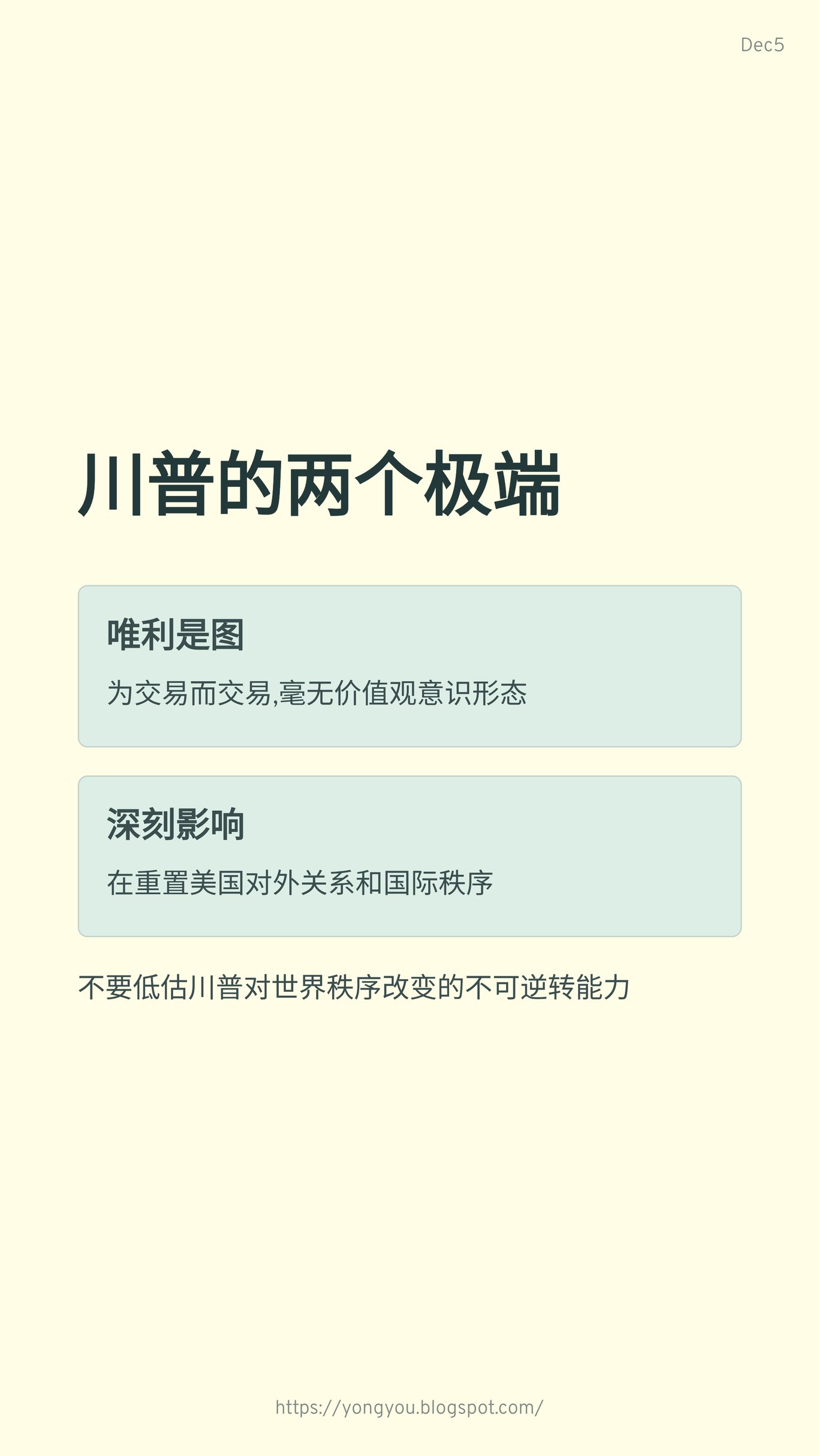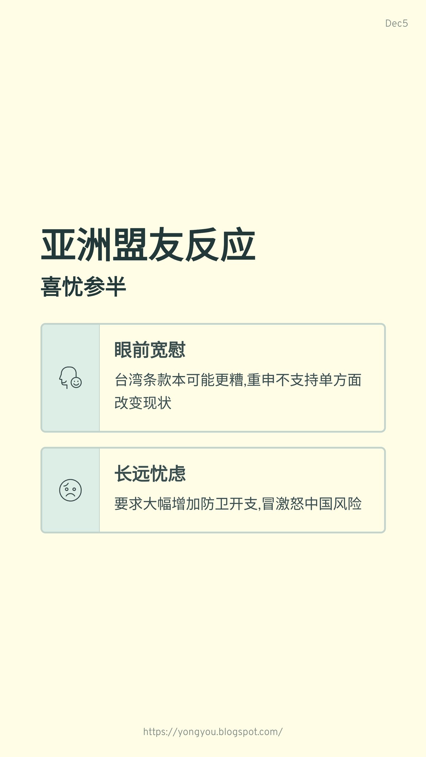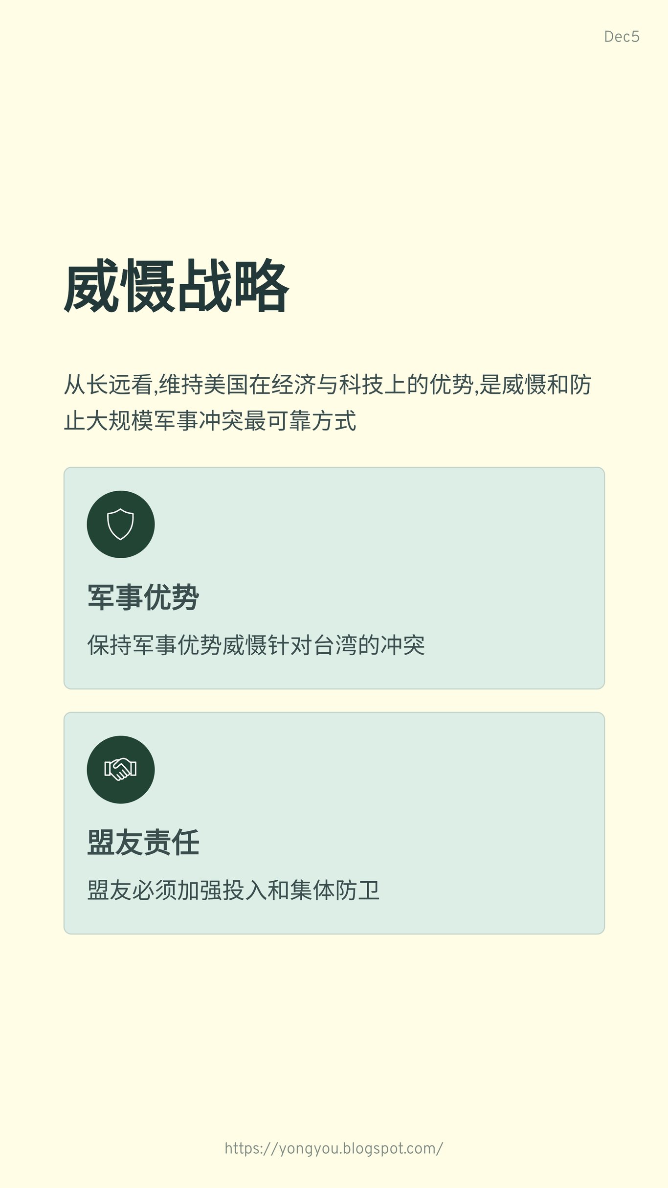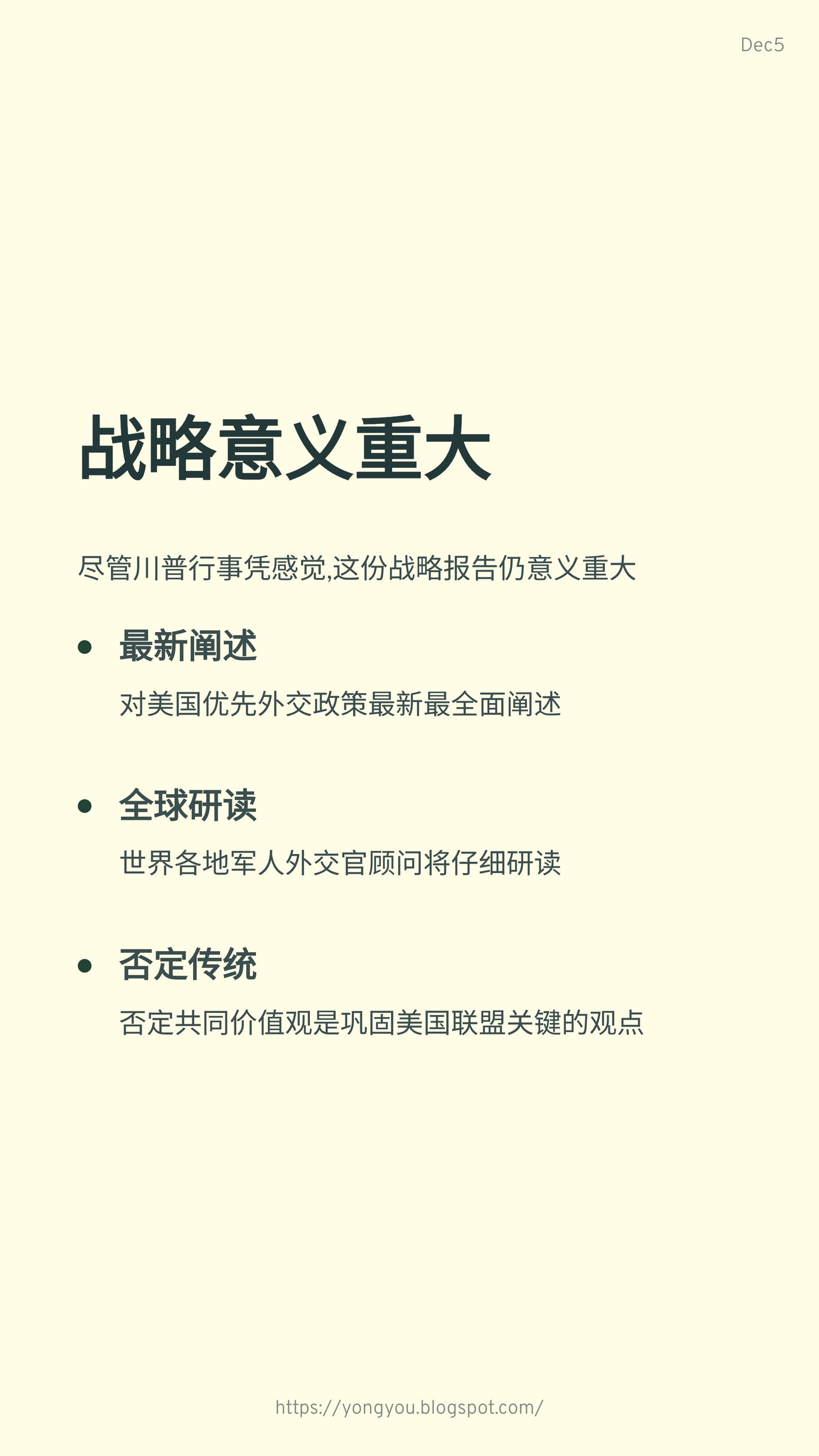本文将深度解析这份战略报告的核心内容、其对欧美同盟的冲击、对中美关系的微妙重构,以及这一战略转向背后的深层逻辑。---## 一、 战略核心转向:本土优先与西半球主导经历了11个月的酝酿与推迟,川普政府终于向世界摊出了底牌。这份长达33页的文件,开篇即确立了美国新安全观的基石——**保护本土安全**。与过去几十年强调全球力量投射不同,新战略明确指出:边境安全是国家安全的首要因素,而美国必须在**西半球**保持绝对的主导地位。这一表述是对以往“美国作为世界警察”角色的根本性修正。文件直言不讳地指出,冷战后外交精英们关于“美国永久主导全球”的信念是错误的。川普政府划定了一条新的红线:**只有当国家行为直接威胁到美国利益时,其事务才与美国相关。** 这意味着,美国将主动放弃相当一部分战后长期主导的全球事务,转而通过收缩战略资源来巩固后院。副总统万斯(JD Vance)在社交媒体上的言论为这一战略做了最直白的注脚。他表示,美军不应在世界各地执行“不可能的任务”,华盛顿的底线是动用军队摧毁属于西半球的毒品恐怖分子。这标志着美军的管辖范围被重新定义为北美、南美及其周边水域。此外,该战略还注入了浓厚的意识形态色彩,不仅强调减少移民、建立强大的工业基础,更罕见地提及“恢复基督教右翼传统价值观”,呼吁通过传统的家庭结构来“复兴美国的精神”。这一系列举措表明,川普试图通过“内圣外王”的方式——即通过内部的文化与工业重整,以及外部的战略收缩,来确保美国作为“地球上自由家园”的地位。## 二、 欧洲的至暗时刻:北约防务移交与对俄战略缓和如果说新战略对西半球是“强化控制”,那么对欧洲则是“严厉通牒”。《华尔街日报》评论称,这份文件将矛头直指欧洲,其批评之严厉、态度之直白,可谓前所未有。**1. 2027年最后期限:**据路透社独家报道,与白宫报告同步形成的五角大楼防务战略文件设定了一个令欧洲震惊的时间表:**美国希望欧洲在2027年前接管北约的大部分常规防御能力**,从情报体系到导弹防御。美方官员甚至警告,如果届时达不到要求,美国可能会停止参与北约的防务协调机制。这意味着,美国计划在三年内从北约的“主角”退居为“配角”,将防务重担彻底甩给欧洲。**2. 批评欧洲政治现状:**文件对欧洲各国政府进行了毫不留情的抨击,指责许多欧洲官员依托不稳定的少数派政府,对乌克兰战争抱有“不切实际的幻想”,甚至为了镇压反对声音而践踏民主原则。报告暗示,移民问题正在从根本上改变欧洲的身份认同,未来某些北约国家可能不再被视为传统的“欧洲国家”,这将损害其与美国的盟友关系。**3. 对俄立场的历史性反转:**与其2017年第一任期时的报告截然不同,川普政府不再将俄罗斯定义为意识形态上的死敌,反而强调要与俄罗斯“重建战略稳定”。美国试图将自己定位为莫斯科与焦虑的欧洲之间的“调节者”和“缓和力量”。文件虽然呼吁防止俄欧爆发战争,但对普京的侵略行径几乎未置一词,反而暗示欧洲人渴望和平(哪怕意味着屈服),是欧洲政府在阻碍和平进程。这种近乎绥靖的态度,无疑让基辅感到寒意,却让克里姆林宫看到了地缘政治的巨大机遇。## 三、 对华战略的“双重面孔”:经贸降温与军事筑墙相较于对欧洲的疾言厉色,新版战略在涉及中国的部分展现出了极为复杂且微妙的“双重面孔”。**1. 经贸层面的“去意识形态化”:**在专门论述中国的章节中,川普政府一改往日将中共视为“价值观敌人”的激烈措辞,甚至删除了“战略安全”、“脱钩”等敏感字眼。报告将中美分歧尽量聚焦在具体的**贸易再平衡**上,强调对等、公平以及恢复美国经济的独立性。这似乎印证了外界关于川习会后美国对华态度软化的猜测。报告虽然提及中国21次,且开头抱怨美国被中国“欺骗”了,但整体基调更像是在寻求一种务实的商业谈判筹码,而非全面的冷战对抗。**2. 军事层面的“前线承包制”:**然而,若是认为美国对华全面软化,则是巨大的误读。在涉及台湾和南海的章节中,川普政府的战略逻辑异常清晰且强硬。* 不退缩: 与在欧洲的战略收缩不同,美国明确表示不会放松在印太地区的利益保护,将维持长期的对台政策,不支持单方面改变现状。* 第一岛链责任制: 报告提出了革命性的防务分担模式——日本、韩国不再是美国的“辅助”,而是必须承担正面抗击任务的**“前线国家”**。美国要求盟友大幅增加防卫开支,并向美军更大程度地开放港口和基地,以便美军进行机动调遣。* 南海自由航行: 报告强调,南海通道涉及全球三分之一的航运,对美国经济至关重要,美国将“不惜一切代价”维护航道畅通,防止单一国家控制。简而言之,川普对华策略表现为:在赚钱的生意上可以谈,但在地缘安全上,通过武装盟友、强化岛链封锁,实际上是在推进更具实效的军事遏制,而非退缩。## 四、 国际秩序的“灵活现实主义”与各方反应《经济学人》将川普的新外交哲学总结为**“灵活现实主义”**(Flexible Realism):务实但不实用主义,坚持原则但不理想主义,强硬但不鹰派,克制但不鸽派。这一策略彻底抛弃了二战后以“共同价值观”为基石的联盟体系,转而以纯粹的“美国利益”为导向。这种转变引发了全球范围内的剧烈震荡:* 盟友的恐慌与无奈: 欧洲和亚洲