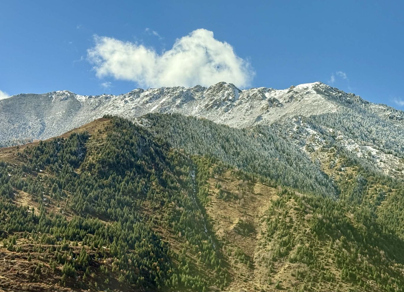 點點頭確認路線便正式啟程,從高鐵站前往九寨溝的沿途全是宛如明信片般的景色,其中最令人念念不忘莫過於能夠近距離欣賞到漂亮的雪景了。據司機大哥分享,今年由於天氣反常、整體氣溫較以往暖和不少,最近的九寨溝並不是每天都會下雪,至於剛剛一路上看到那薄薄的積雪其實是昨夜才下,等待會再晚一點就會因為陽光照射而融化,所以我們算是挑了個很好的時機到來,非常幸運。